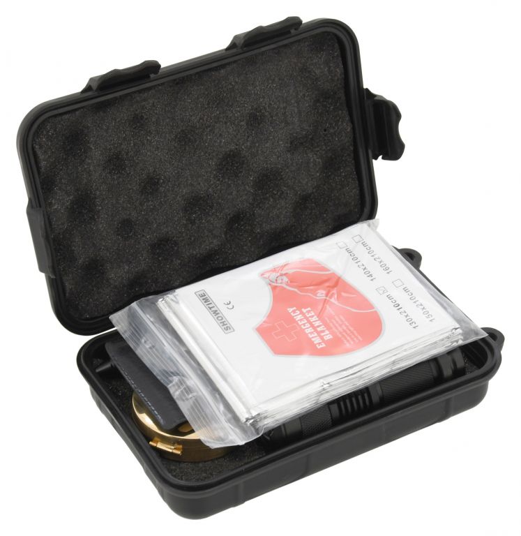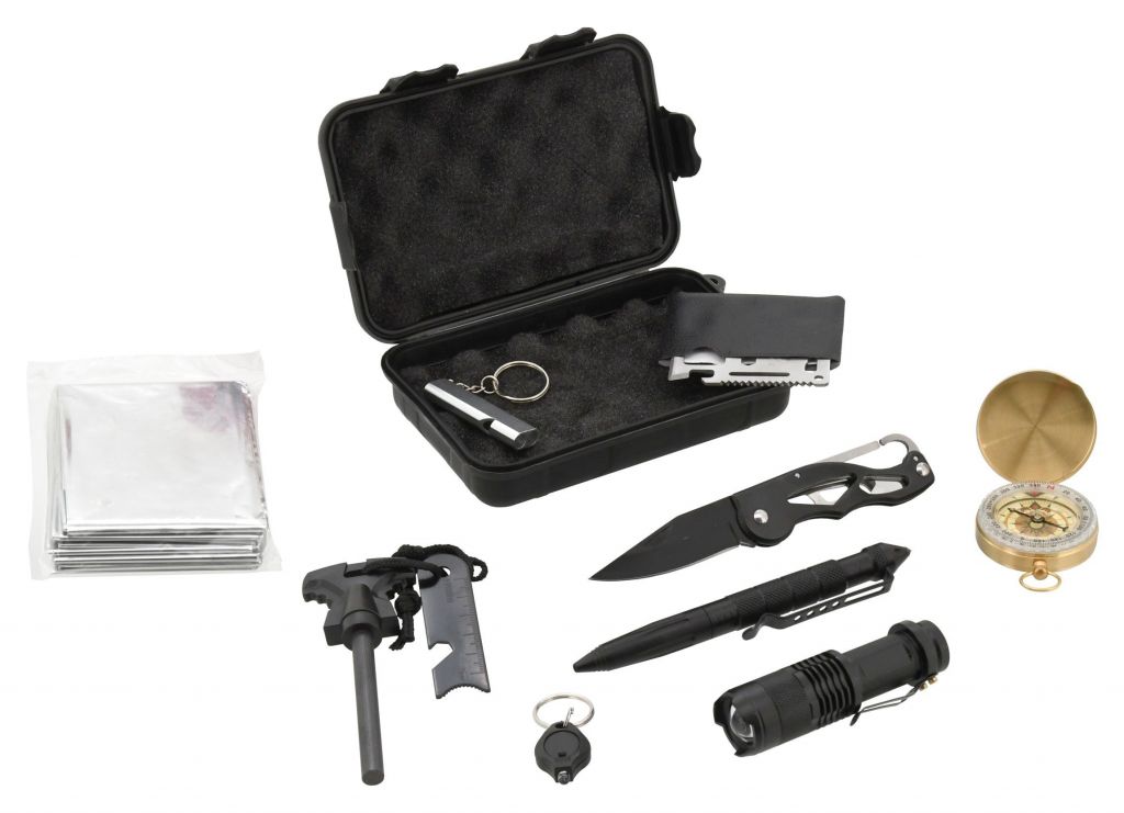 Zestaw SOS składa się z noża zamykającego o długości ostrza 6,5 cm, kart wielofunkcyjnych, gwizdków, kompasu z obrotową skalą, folii biwakowej (izotermicznej), krzesiwa do rozpalania ognia, wisiorka z oświetleniem LED, metalowego długopisu z przebijającą końcówką i lampy LED zasilany baterią AA (brak w zestawie) z regulowanym stożkiem światła dużej mocy. Wszystko jest przechowywane w ochronnej, zamykanej walizce.
