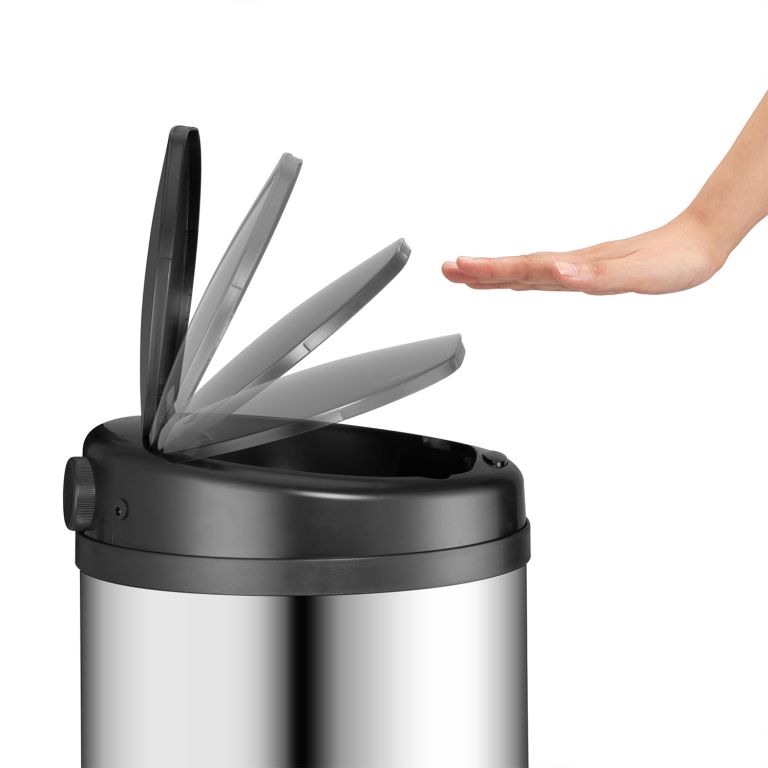 Kosz o pojemności 50 litrów wykonany jest z wytrzymałej stali nierdzewnej z plastikową pokrywą. Czujnik ruchu zapewnia ciche i niezawodne otwieranie pokrywy, a w razie potrzeby można użyć również obsługi dotykowej. Praktyczny pierścień wewnątrz stabilnie utrzymuje worek, dzięki czemu nie przewraca się ani nie wysuwa. Zasilanie zapewniają 4 baterie AA (brak w zestawie).