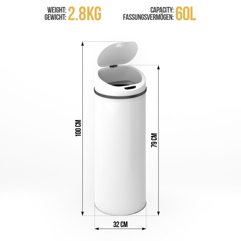 Bezdotykowy kosz na śmieci z czujnikiem, 60 l, biały