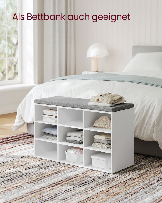 Ukazać szczegółowy opisŁawka z półkami na buty i miękką poduszką. Praktyczne rozwiązanie do przedpokoju i sypialni.