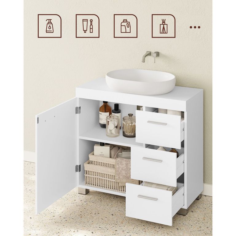Stwórz w swojej łazience porządek i harmonię dzięki eleganckiej białej szafce pod umywalkę. Duża ilość miejsca na ręczniki, kosmetyki i środki czystości ułatwi codzienną rutynę i nada łazience świeży, nowoczesny wygląd.
