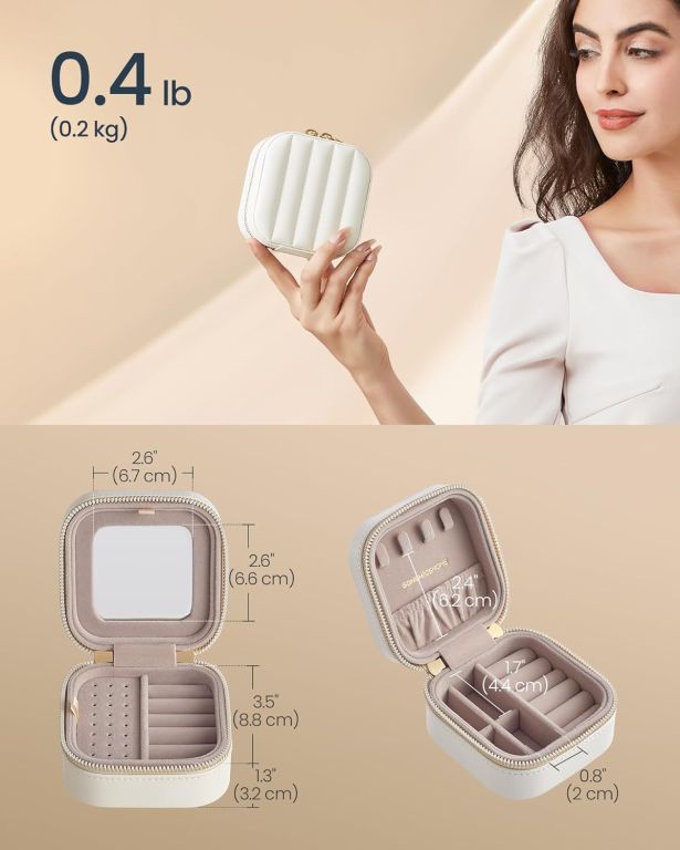 Wnętrze z regulowanymi przegrodami, miejscem na pierścionki i wyjmowaną płytką na kolczyki zapewnia funkcjonalność i bezpieczeństwo. Trwała ekoskóra i miękka podszewka chronią biżuterię przed zniszczeniem. Kompaktowy rozmiar sprawia, że szkatułka zmieści się w każdej torebce lub walizce.