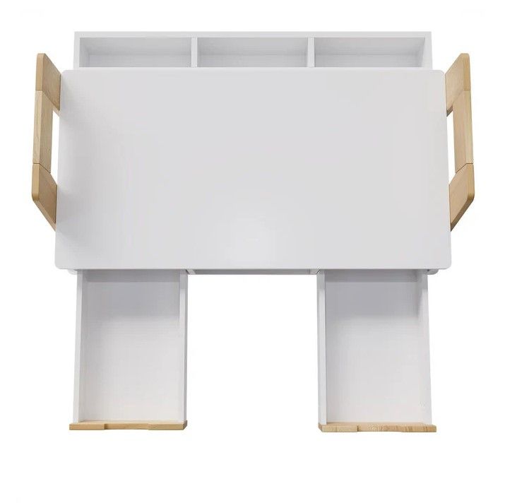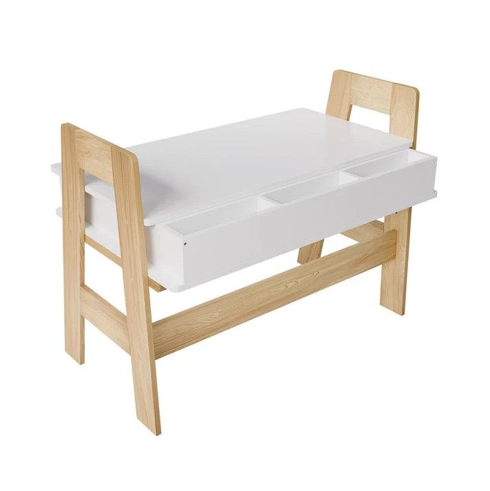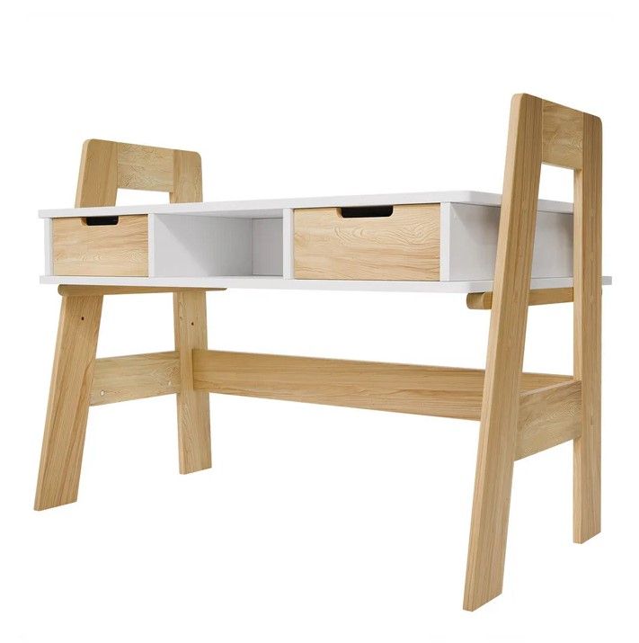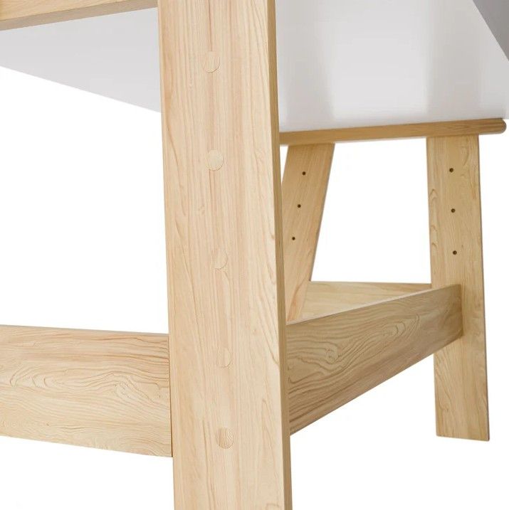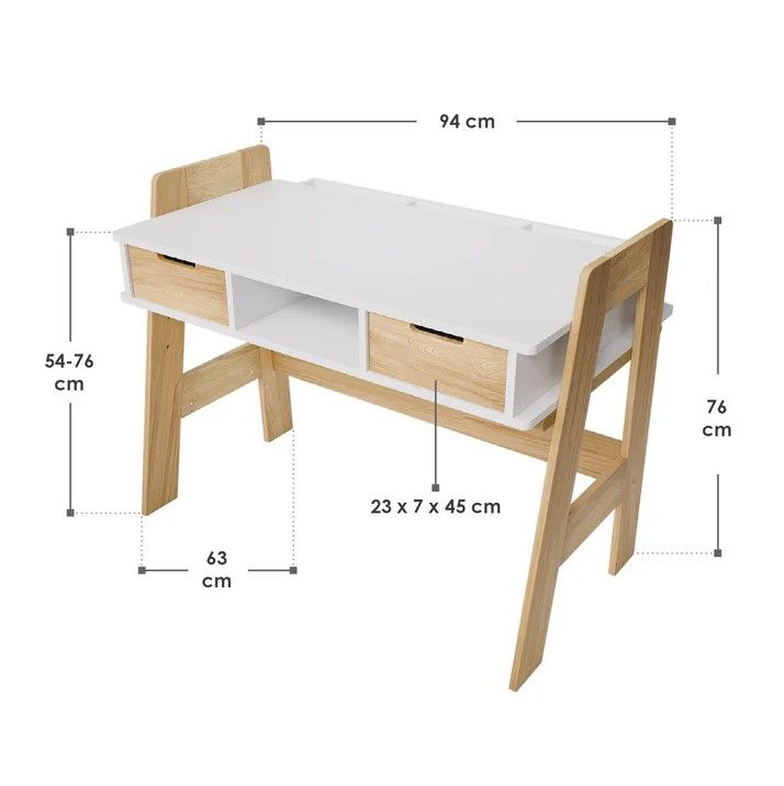 Solidna konstrukcja z melaminowanego drewna zapewnia trwałość i łatwą pielęgnację. Regulowana wysokość pozwala dopasować biurko do wzrostu dziecka, a praktyczne rozwiązania ułatwiają codzienne użytkowanie.