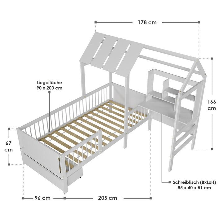 Białe łóżko dziecięce domek Yari z biurkiem i szufladami