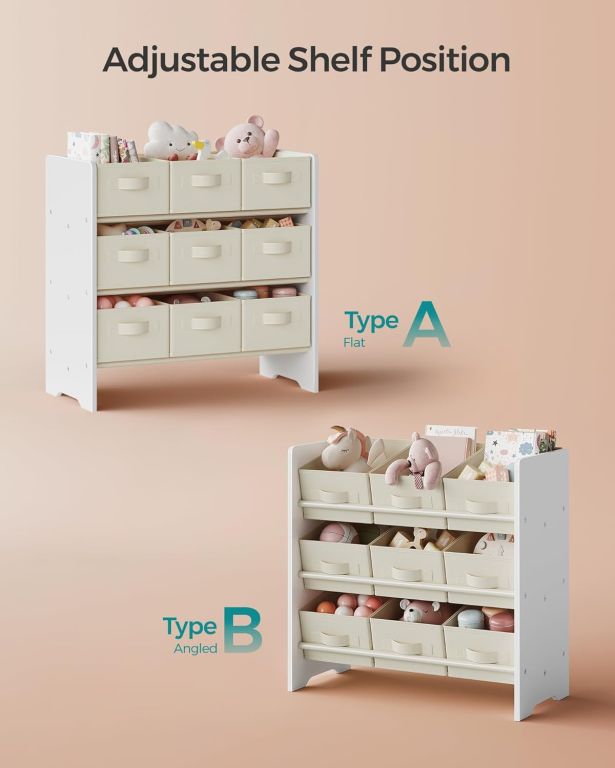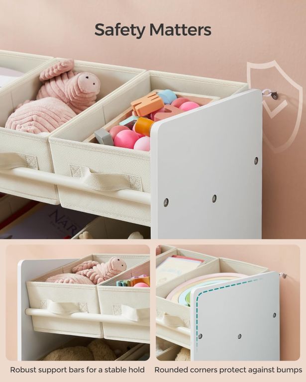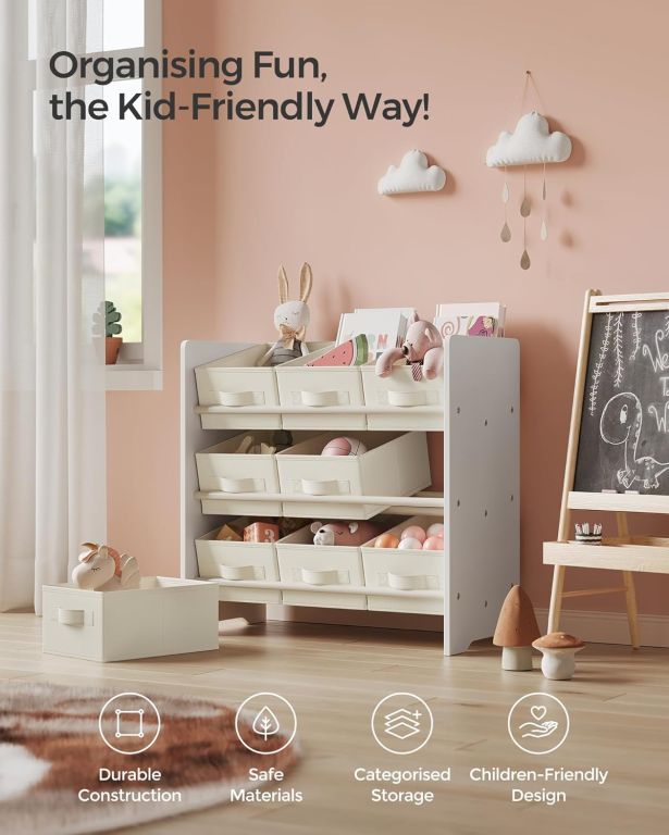 Organizer na zabawki z 9 pojemnikami, idealny do pokoju dziecięcego. Bezpieczny, trwały i łatwy w montażu.