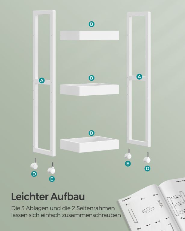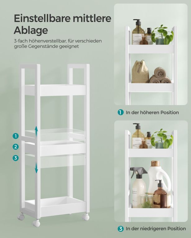 Wytrzymała konstrukcja z bambusa i MDF zapewnia stabilność i długą żywotność. Trzy półki, w tym jedna regulowana, pozwalają dostosować przestrzeń do własnych potrzeb. Kółka można zdemontować, a montaż jest szybki i prosty.