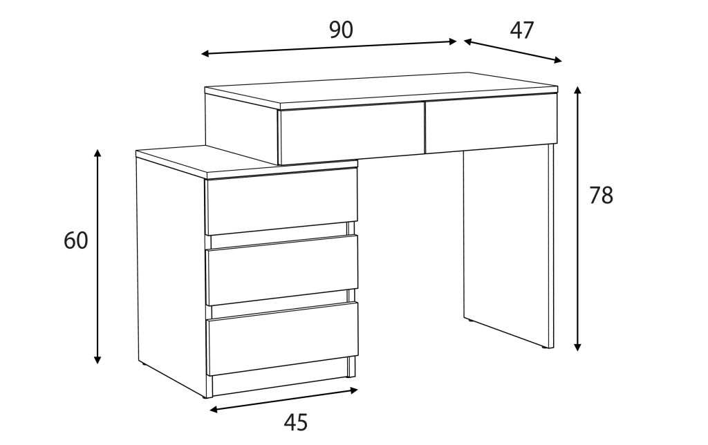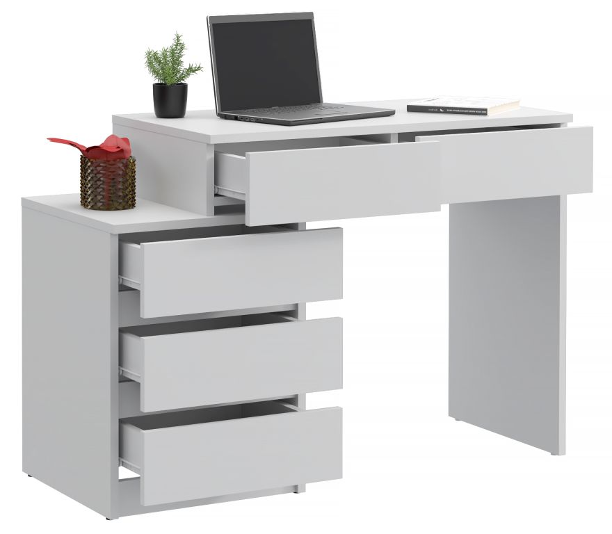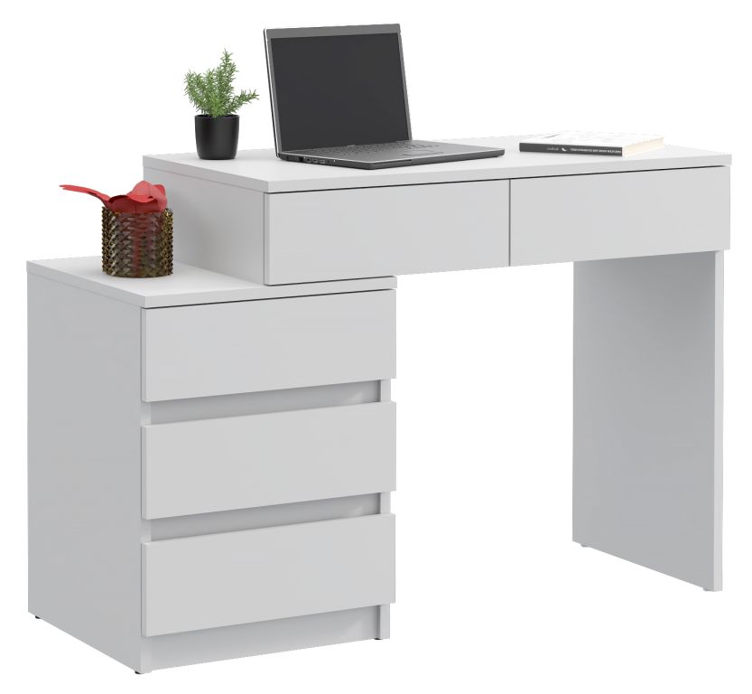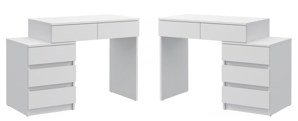 Wykorzystaj maksymalnie przestrzeń swojego pokoju dzięki dużemu, ergonomicznie zaprojektowanemu blatowi oraz aż pięciu pojemnym szufladom. Jedno biurko – dwie możliwości montażu: ustaw blat po prawej lub lewej stronie, w zależności od układu pomieszczenia.