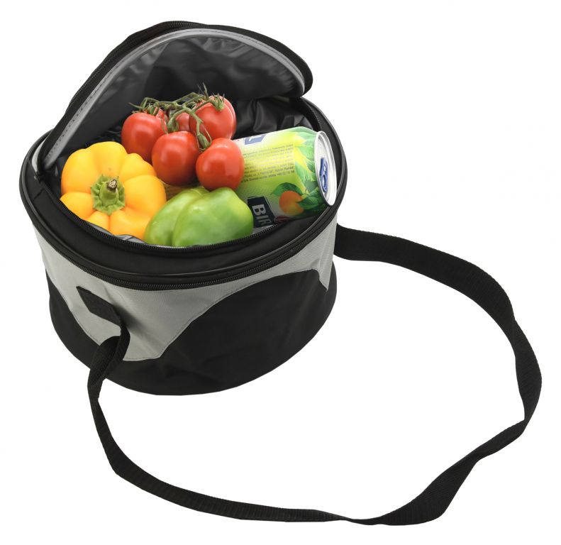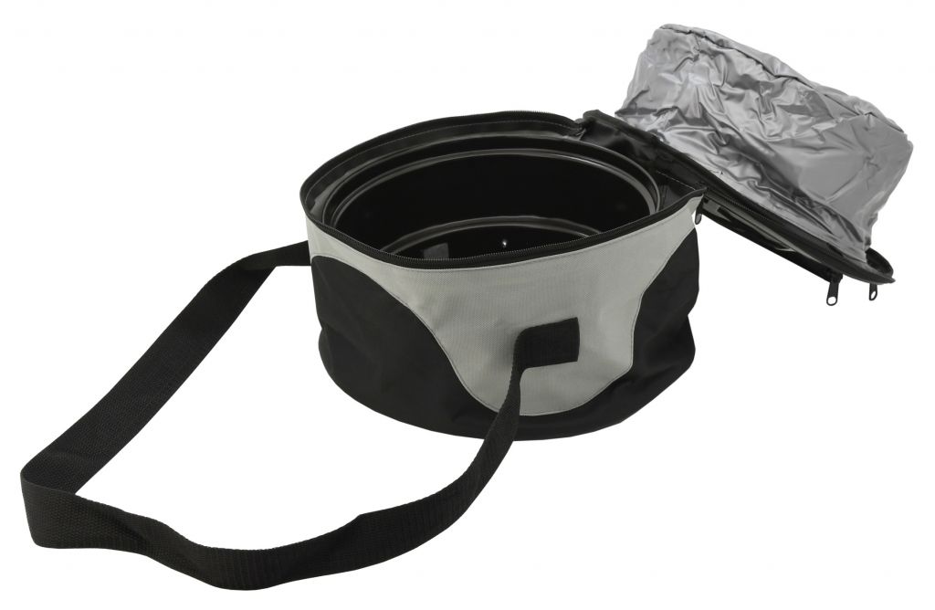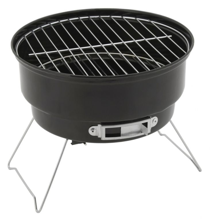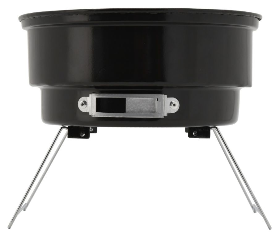 Konstrukcja wykonana jest z wysokiej jakości blachy stalowej emaliowanej na czarno. Stabilność zapewniają dwie metalowe składane nogi. Do przygotowania przekąsek grill wyposażony jest w stalowy ruszt o średnicy 24 cm. Grill wyposażony jest w regulowaną wentylację w dolnej części. Aby ułatwić przenoszenie, składany grill umieszczono w praktycznej torbie z paskiem. Torba wyposażona jest w kieszeń izotermiczną na żywność oraz mniejszą siateczkową kieszeń na drobiazgi.