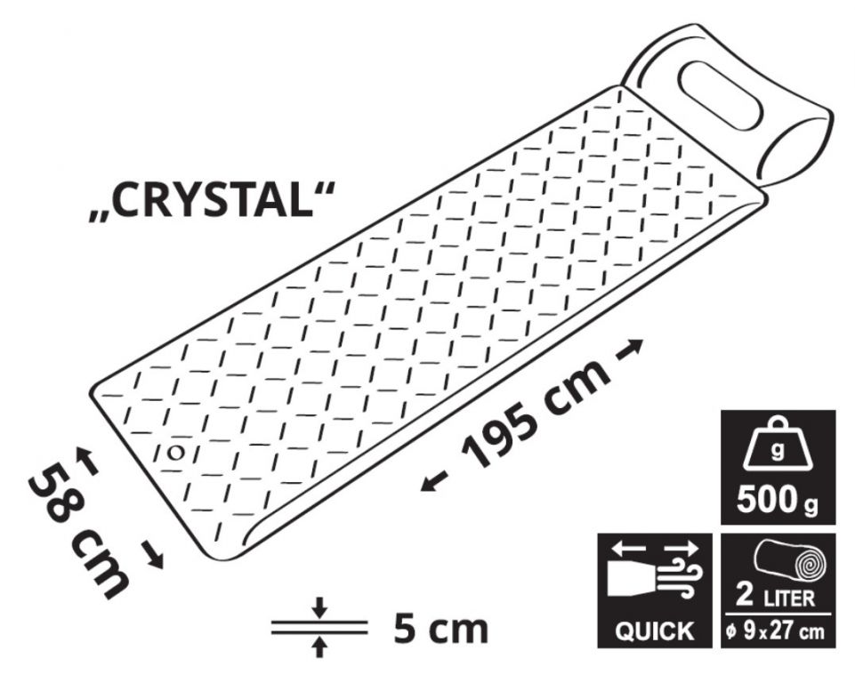 Maty są integralną częścią campingu i outdooru. Posiadają najlepsze właściwości izolacyjne i komfortowe. Mata Crystal jest nadmuchiwana, a dzięki swojemu kształtowi zapewnia bardzo komfortowe użytkowanie. Paczka ma bardzo małe wymiary i wagę, dzięki czemu nie ma problemu, aby mieć ją zawsze pod ręką, jako bagaż podręczny w naturze. Mata wyposażona jest również w poduszkę, zapewniającą komfort w każdych warunkach.