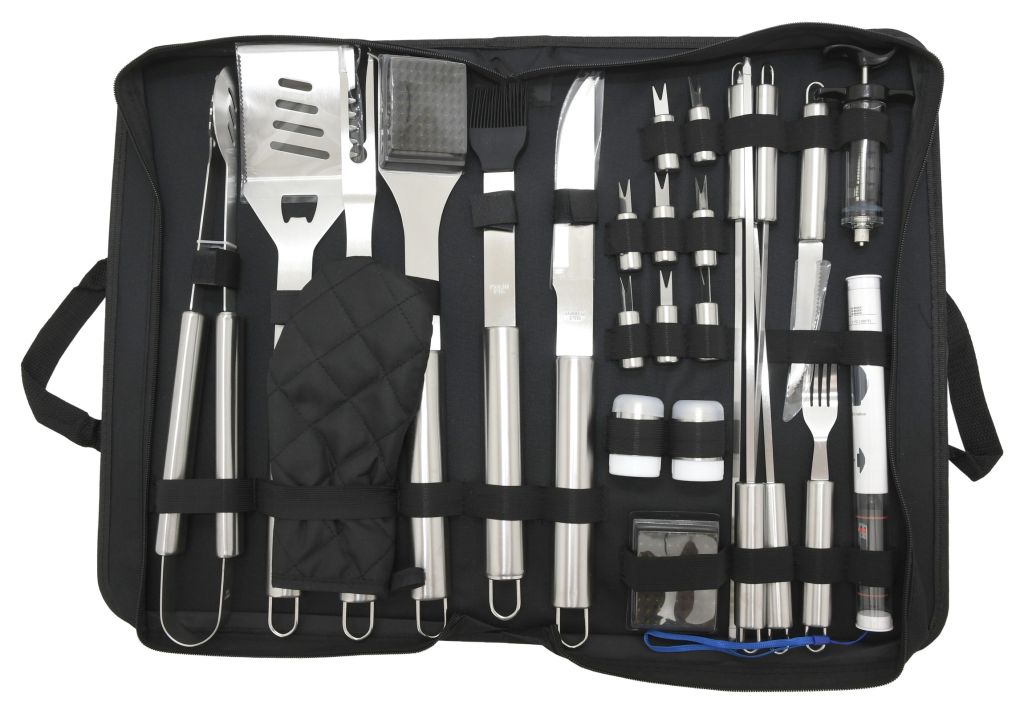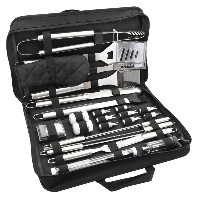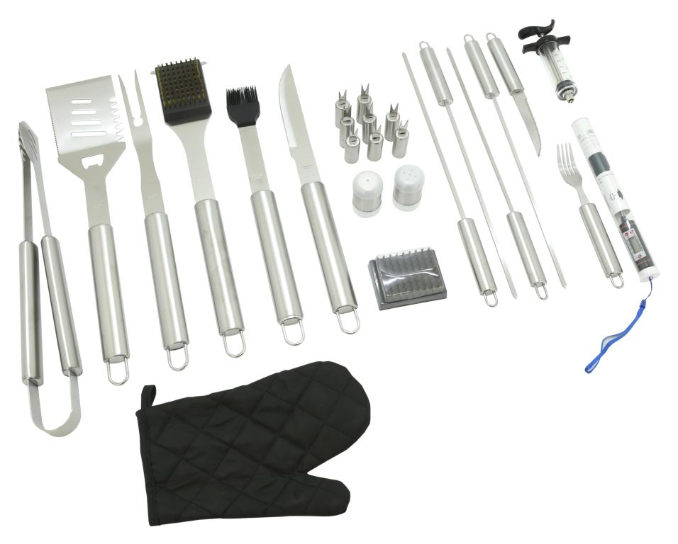 Zestaw zawiera wszystkie narzędzia do przygotowania i spożycia różnych potraw, a także późniejszej konserwacji grilla. Ponadto wszystkie narzędzia wykonane są z wysokiej jakości stali nierdzewnej. W zestawie między innymi nastrzyk do nakładania marynaty na mięso oraz praktyczny termometr z sondą ze stali nierdzewnej do weryfikacji wzoru mięsa o zakresie pomiarowym -50 - 300 °C. 1x bateria LR44 (1,5V) zapewnia zasilanie termometru. Zestaw jest zgrabnie umieszczony w tekstylnej torbie i jest odpowiedni dla najbardziej wymagających fanów dobrego jedzenia. Lista poszczególnych narzędzi doceni każdy. Zestaw przeznaczony jest przede wszystkim do użytku w domu w ogrodzie, ale przydaje się również w podróży.
