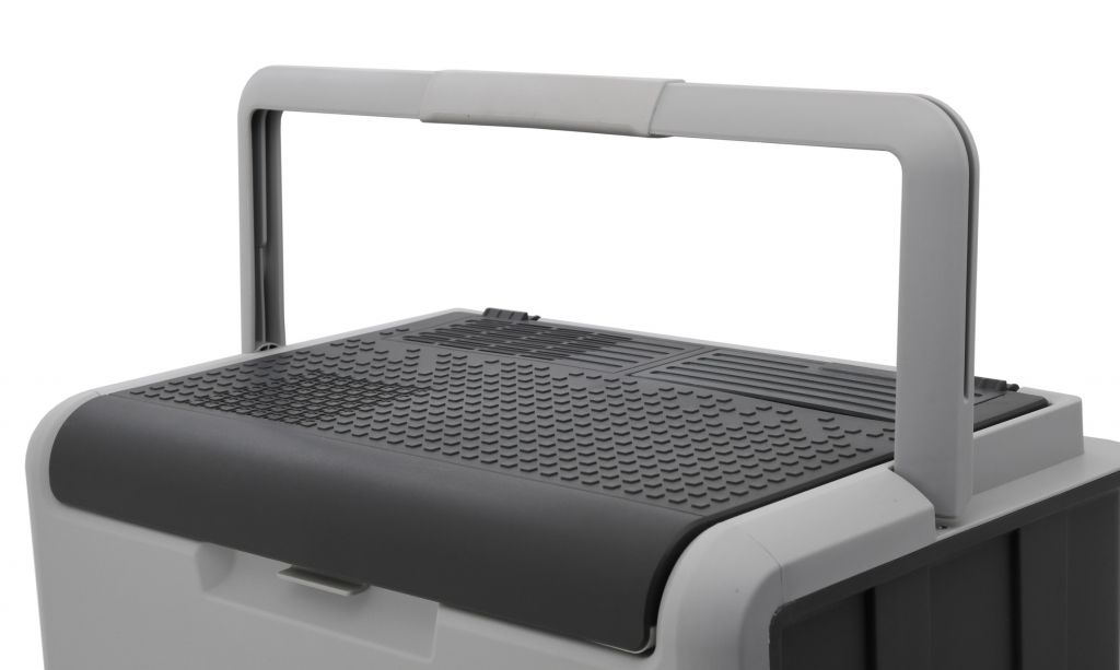 Przenośny box chłodzący, zasilany z gniazda zapalniczki samochodowej 12 V lub z gniazda 230 V. Idealny towarzysz w podróży, na wakacjach, na pikniku, a nawet na zakupach. Wewnętrzna pojemność 30 litrów może pomieścić dużą ilość jedzenia. Dzięki zagłębieniu w pokrywie można wygodnie umieścić w chłodziarce nawet wysokie butelki z napojami. Box jest bardzo łatwy do przenoszenia, wyposażony w praktyczny uchwyt ułatwiający transport. Jest to chłodziarka oparta na termoelektrycznym systemie chłodzenia z wentylatorem, nie zawierającym freonów. Dzięki niemu temperatura wewnątrz może być o 15 - 20°C niższa od temperatury otoczenia (przy 25°C). Po podłączeniu do gniazdka 230 V można ustawić pożądaną intensywność chłodzenia za pomocą pokrętła (sterowanie znajduje się w skrzynce kablowej), co pozwala znacznie zaoszczędzić zużycie energii.