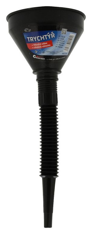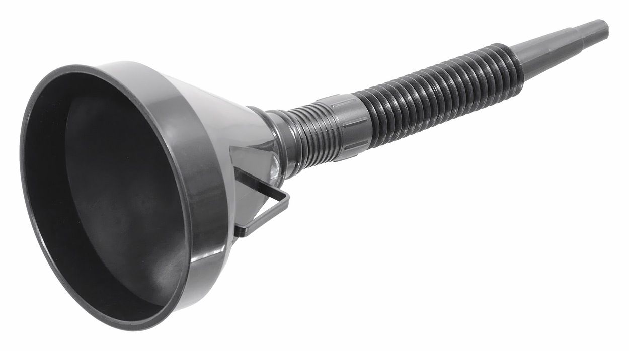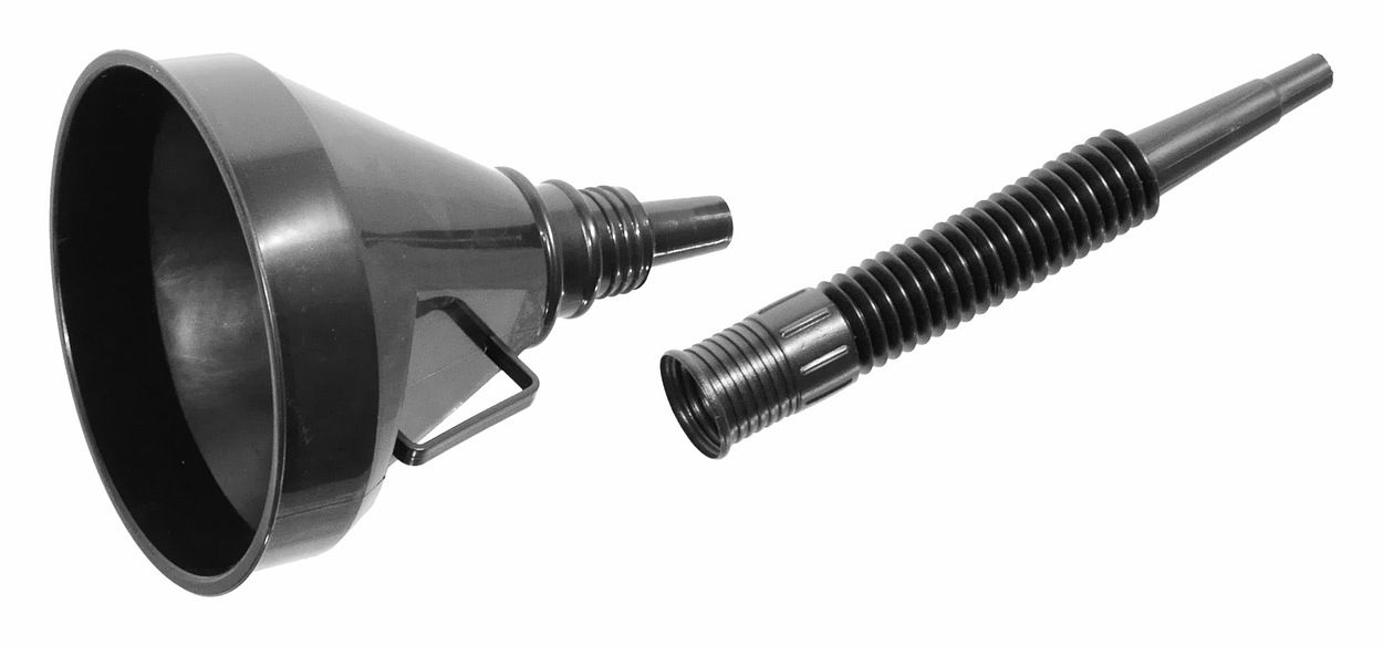 Lejek do przelewania płynów, wyposażony we wbudowane sitko i wkręcany lejek. Lejek o długości 25 cm jest elastyczny, dzięki czemu zapewnia wygodę podczas przenoszenia i nalewania. Lejek wykonany jest z wytrzymałego czarnego tworzywa sztucznego o średnicy 143 mm.