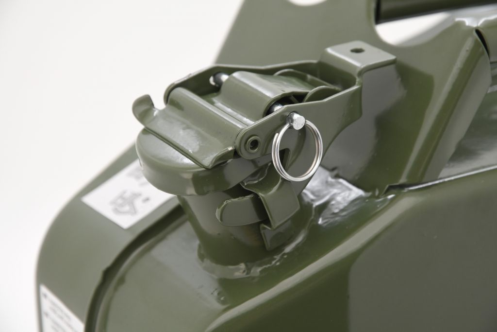 Kanister na paliwo. Szyjka kanistra jest wyposażona w mechanizm zamykający z korkiem, uszczelką i zabezpieczeniem przed otwarciem.