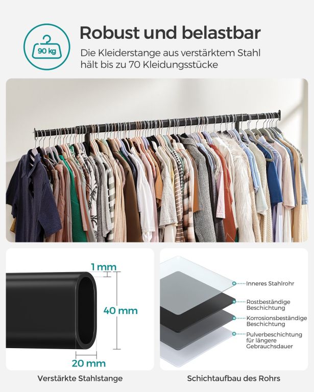 Wprowadź porządek i styl do swojej garderoby z tym eleganckim stojakiem na ubrania. Regulowana szerokość pozwala dopasować miejsce na ubrania i akcesoria, a czarny kolor dodaje nowoczesnego charakteru.