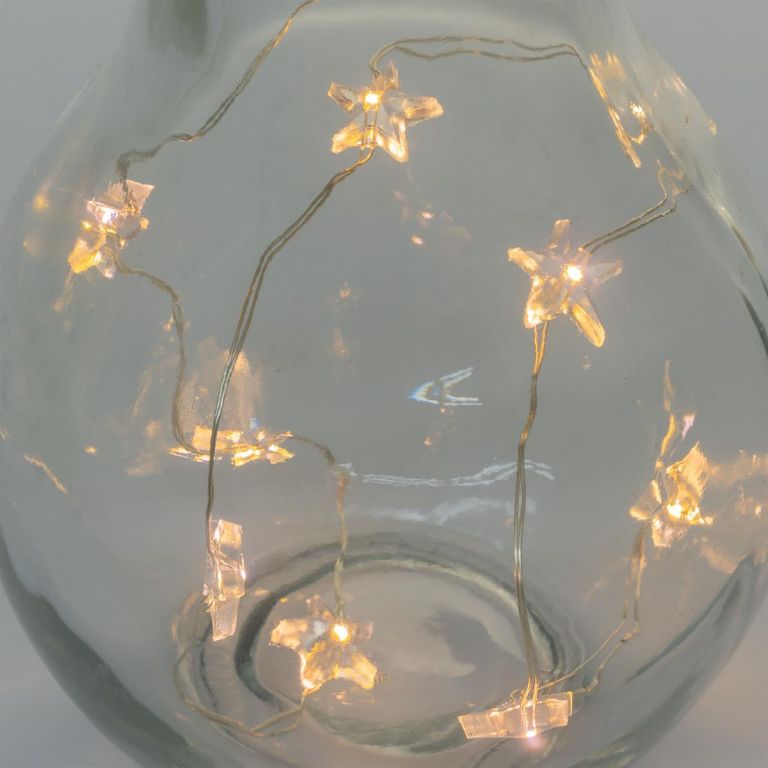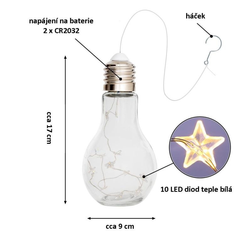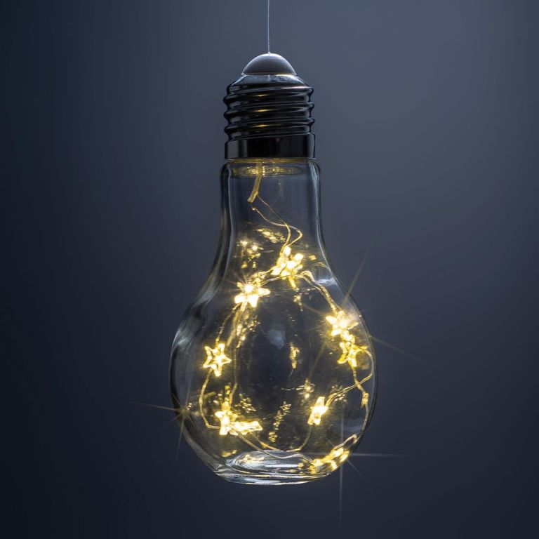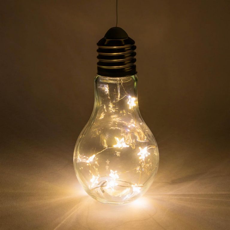 Niezwykła świąteczna kula imituje wygląd żarówki. Żarówka jest wypełniona drobnym łańcuchem LED z 10 diodami w kształcie gwiazdy.