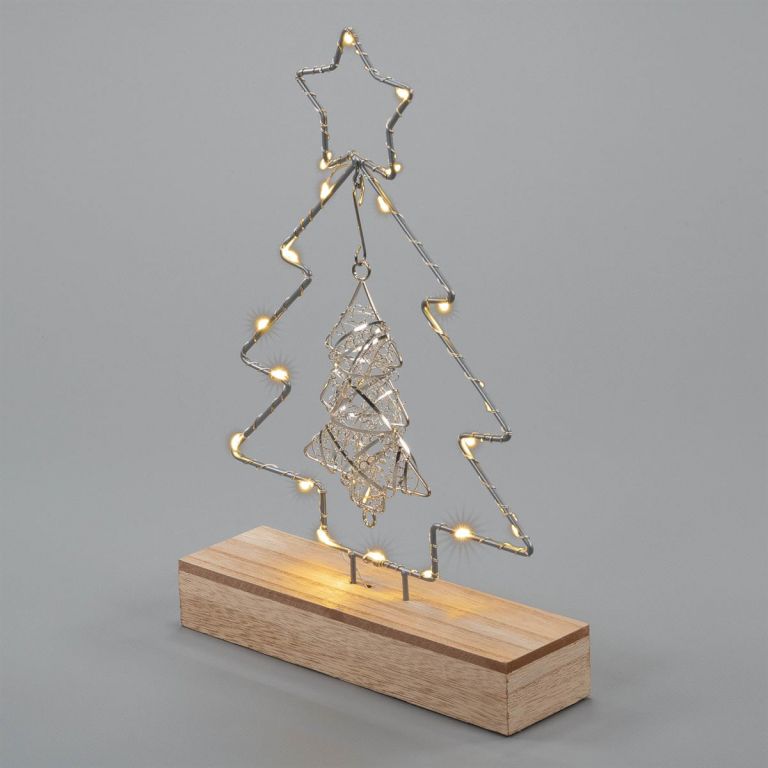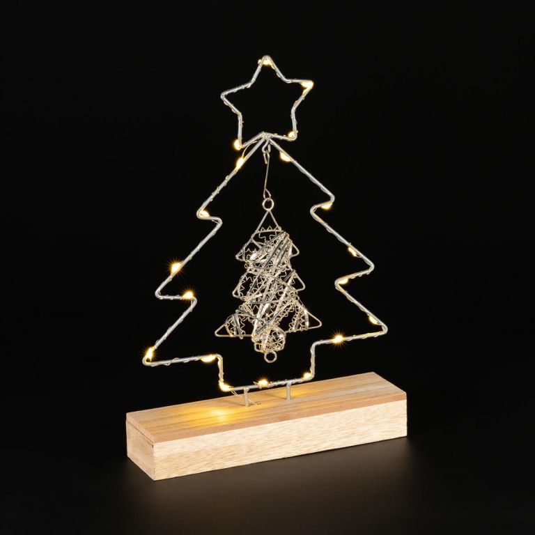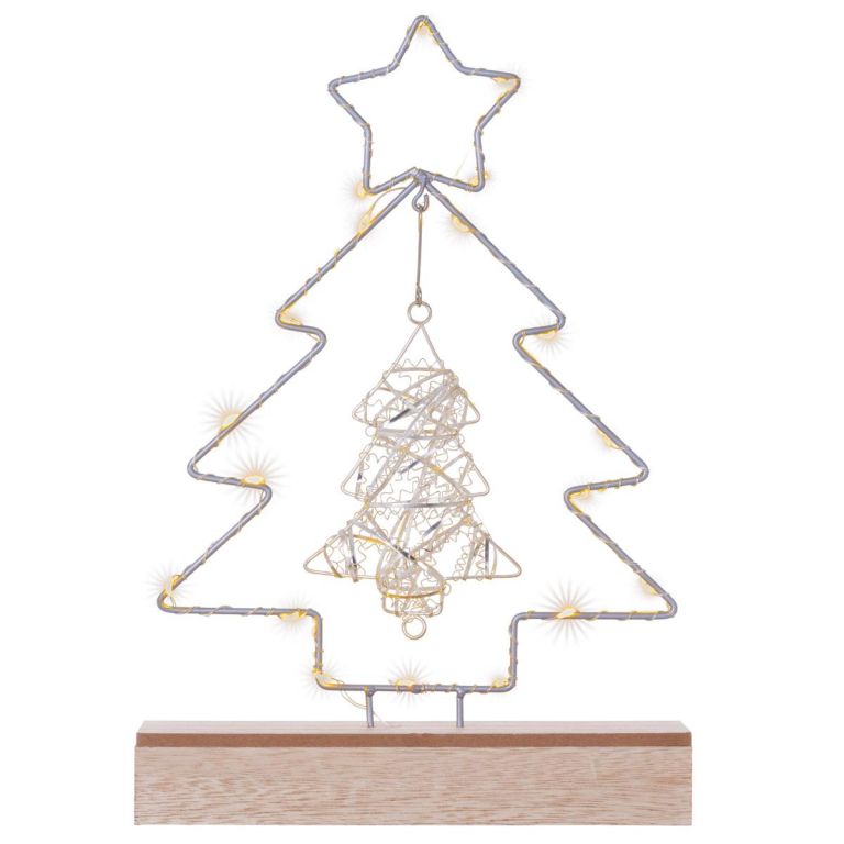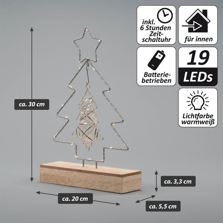 Czy to na parapecie, na komodzie czy na stoliku kawowym, jasna choinka wszędzie stworzy przytulną świąteczną atmosferę. Całkowita wysokość lampy nastrojowej wynosi 30 cm, a szerokość to 20 cm. Szczyt choinki ozdobiony jest dużą stylizowaną gwiazdą, która dopełnia całości. Drewniana podstawa zapewnia stabilną podstawę. Niskie zużycie energii gwarantuje 19 ciepłobiałych diod LED. Zasilanie bateryjne oznacza, że jesteś niezależny od gniazdek i możesz umieścić dekoracyjne drzewko w dowolnym miejscu w pokoju. Zintegrowana funkcja timera jest również praktyczna. Po ustawieniu gwiazda będzie świecić zawsze o wybranej godzinie przez 6 godzin. Opcjonalna funkcja timera lub oświetlenie ciągłe. Obszary zastosowania lampki choinkowej: ogród zimowy, korytarz, pokój świąteczny, foyer. Uzupełnij swoje dekoracje świąteczne innymi wspaniałymi zimowymi, bożonarodzeniowymi i letnimi dekoracjami świetlnymi, takimi jak łańcuchy świetlne, drzewka świetlne, siatki świetlne, kurtyny świetlne, gałązki LED, bombki, gwiazdki, renifery, latarnie i świece z naszej oferty.