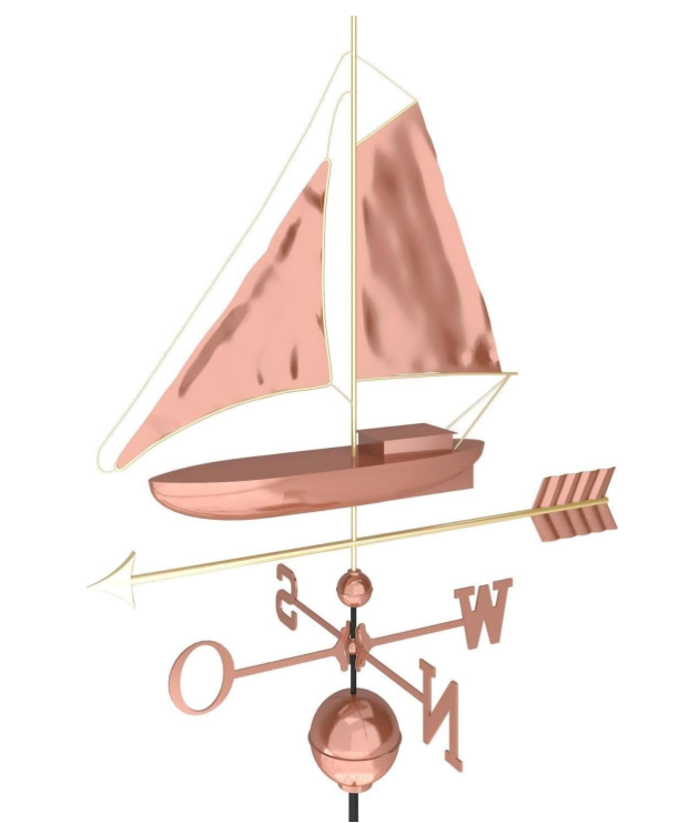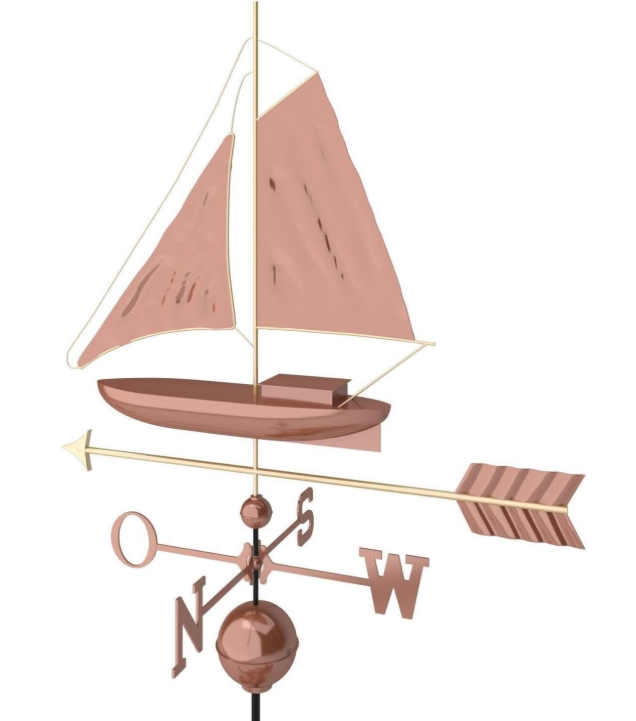 Dekoracyjna miedziana wiatrowskaz żaglówka – trwała, ręcznie wykonana ozdoba dachu.