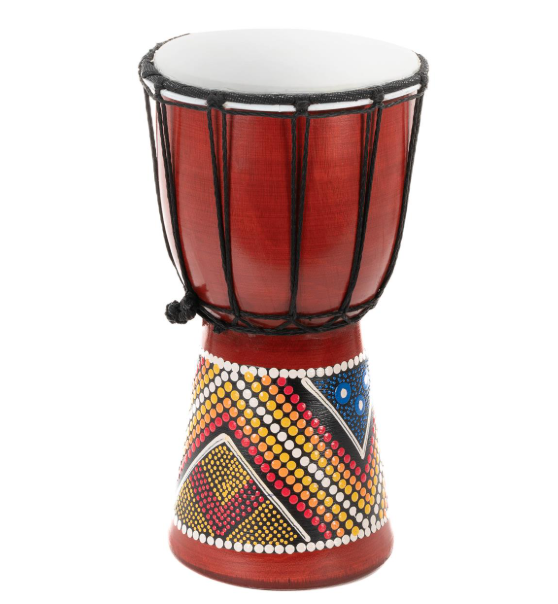 Ręcznie malowany djembe z mahoniu i koziej skóry, idealny dla dzieci i dorosłych.