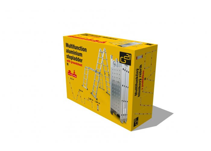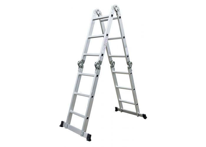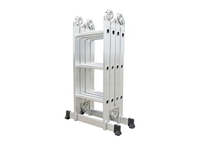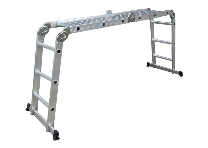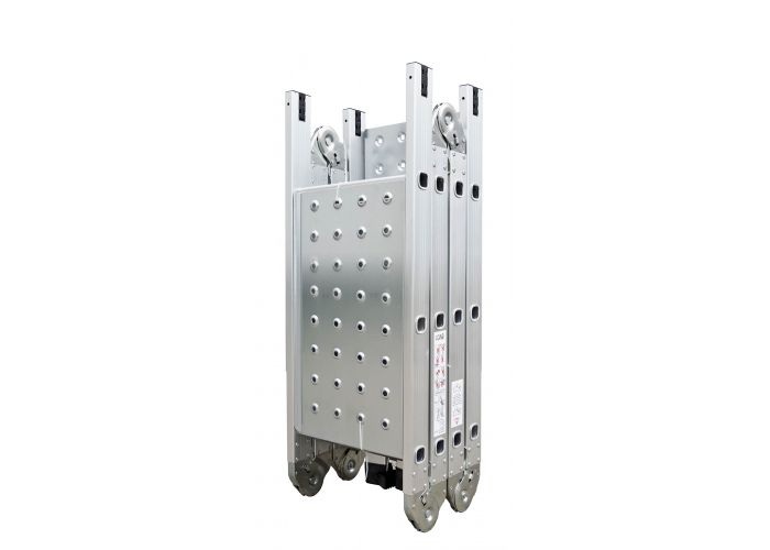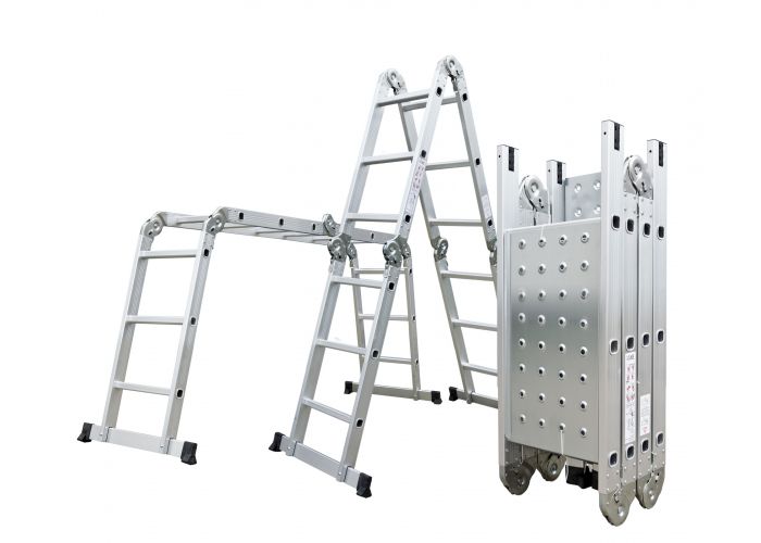 Aluminiowa drabina przegubowa wielofunkcyjna z funkcją rusztowania z podestem. Znakomity produkt pierwotnie stworzony dla specjalistów, charakteryzuje się dostatecznie sztywną konstrukcją. Drabina składa się z czterech elementów, które połączone są przegubami. Może pełnić funkcję drabiny przystawnej, dwustronnej wolnostojącej oraz rusztowania. Można ją wykorzystywać podczas różnego rodzaju prac budowlanych i dekoracyjnych, w warsztacie, w domu, w ogrodzie, itp. Można ją szybko i bez trudu złożyć do rozmiarów swobodnie mieszczących się w bagażniku.