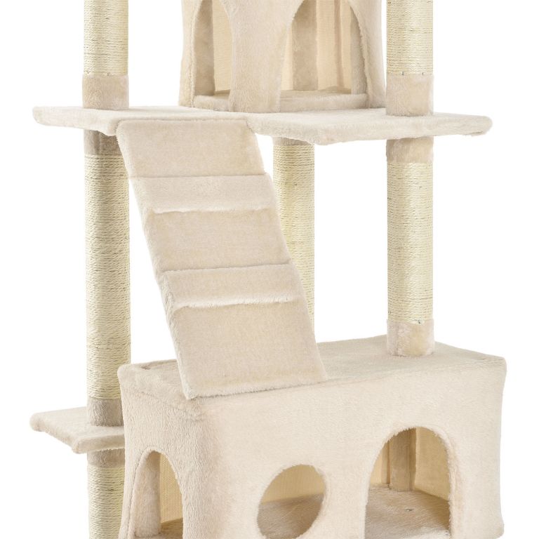 W konstrukcji znajdują się dwie pluszowe budki do spokojnego wypoczynku, trzy legowiska na wyższych poziomach z widokiem na otoczenie, siedem sizalowych słupków do ostrzenia pazurów, dwie skośne rampy oraz trzy zawieszone zabawki w kształcie myszy. Konstrukcja z płyty MDF, pokryta miękkim pluszem, jest solidna, stabilna i przyjemna w dotyku.