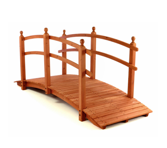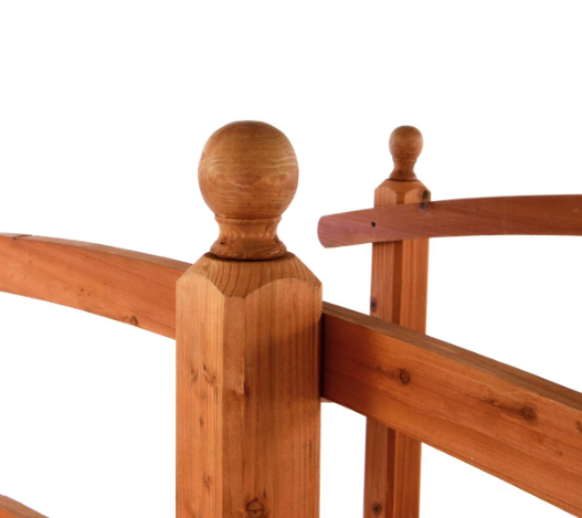 Niepowtarzalna drewniana kładka, wykonana z drewna sosnowego w kolorze czerwono-brązowym. Idealna do dekoracji małych potoków i rowów. Doskonała ozdoba pomiędzy kwiatami, przy oczku wodnym lub w każdym innym miejscu. Zaletą jest również łatwy montaż.