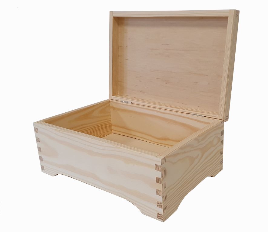 Solidna konstrukcja z litej sosny gwarantuje trwałość i stabilność. Pudełko nie jest lakierowane, więc możesz je pomalować według własnego gustu lub pozostawić w surowej formie. Montaż nie jest wymagany – produkt dostarczany jest w całości.