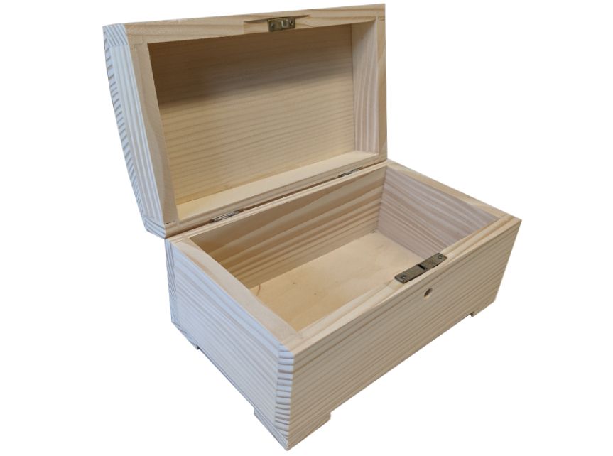 Drewniana skrzynia wykonana jest z litego drewna sosnowego, jest niewykończona i może być pomalowana dowolnym produktem przeznaczonym do drewna lub pozostawiona w naturalnym, niepomalowanym stanie. Skrzynia jest przydatna do przechowywania pamiątek, zdjęć, dokumentów lub papierów.