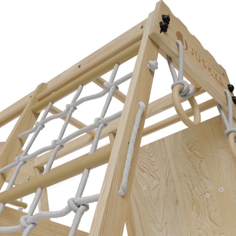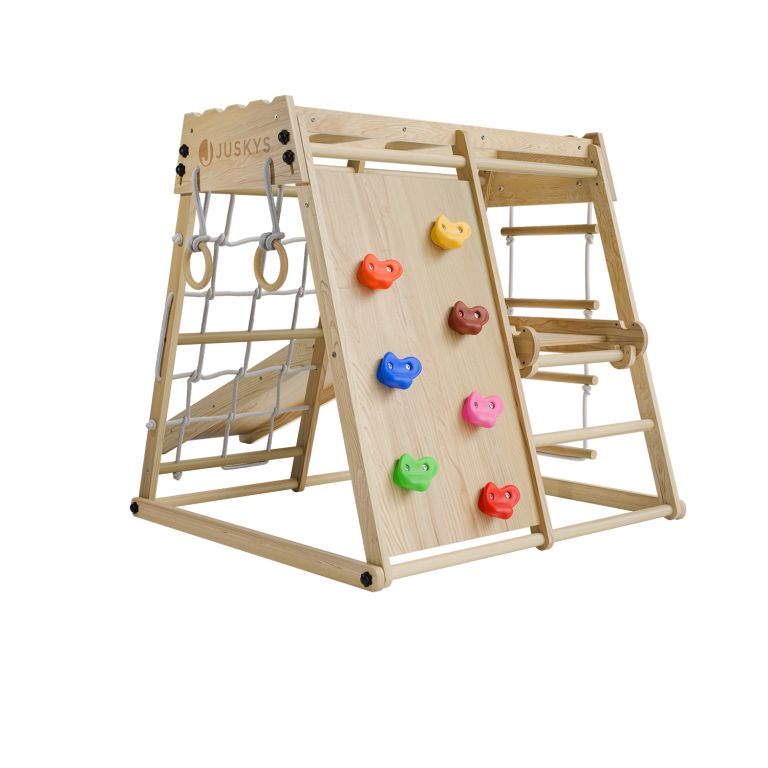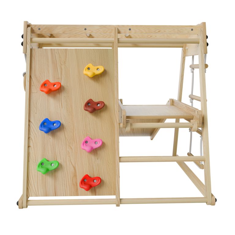Plac zabaw wykonany jest z solidnego i wysokiej jakości drewna sosnowego i jest zaprojektowany do bezpiecznego użytkowania przez maksymalnie troje dzieci jednocześnie. Dzięki praktycznej konstrukcji składanej zestaw można szybko złożyć, zwalniając przestrzeń w pokoju. Kolorowe uchwyty wspinaczkowe i naturalne wykończenie nadają konstrukcji atrakcyjny, przyjazny wygląd, pasujący do każdego wnętrza dziecięcego.