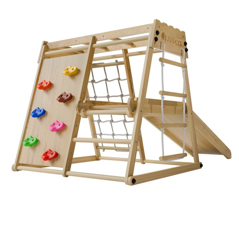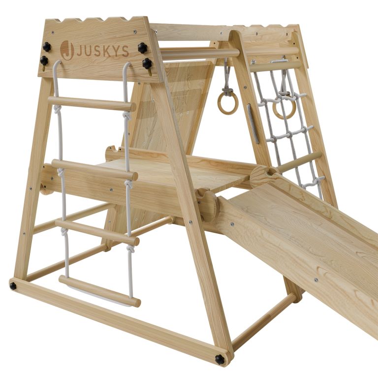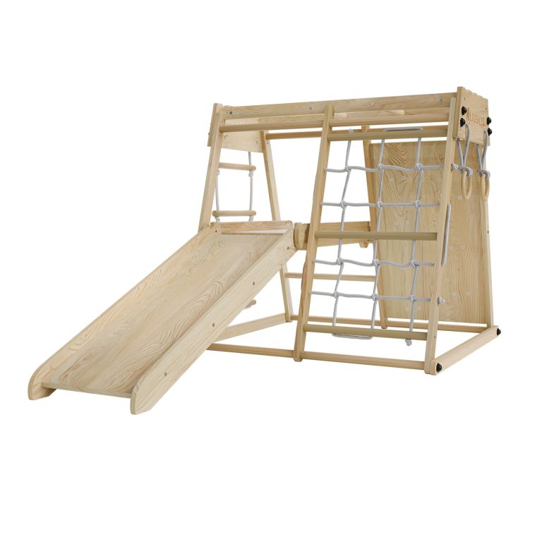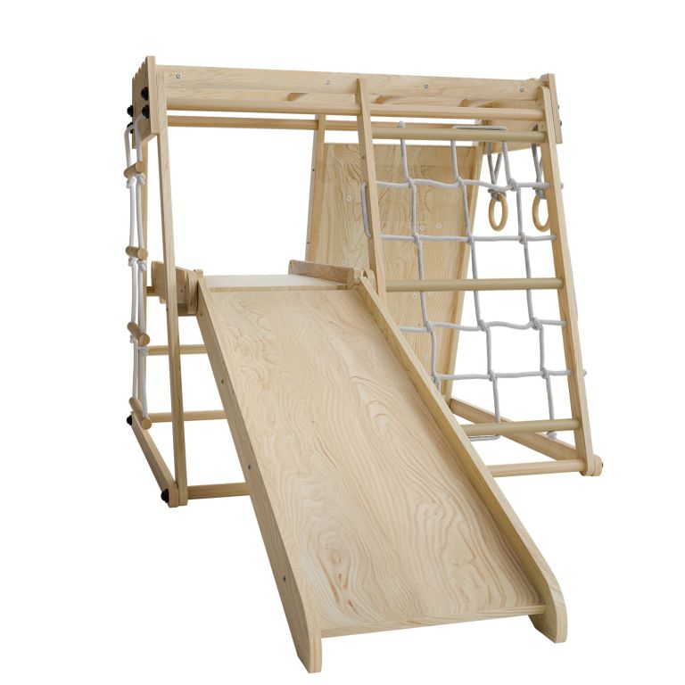 Wielofunkcyjny, drewniany plac zabaw do wnętrz z ścianką wspinaczkową, zjeżdżalnią i dodatkami do wspinaczki. Możliwość szybkiego składania.