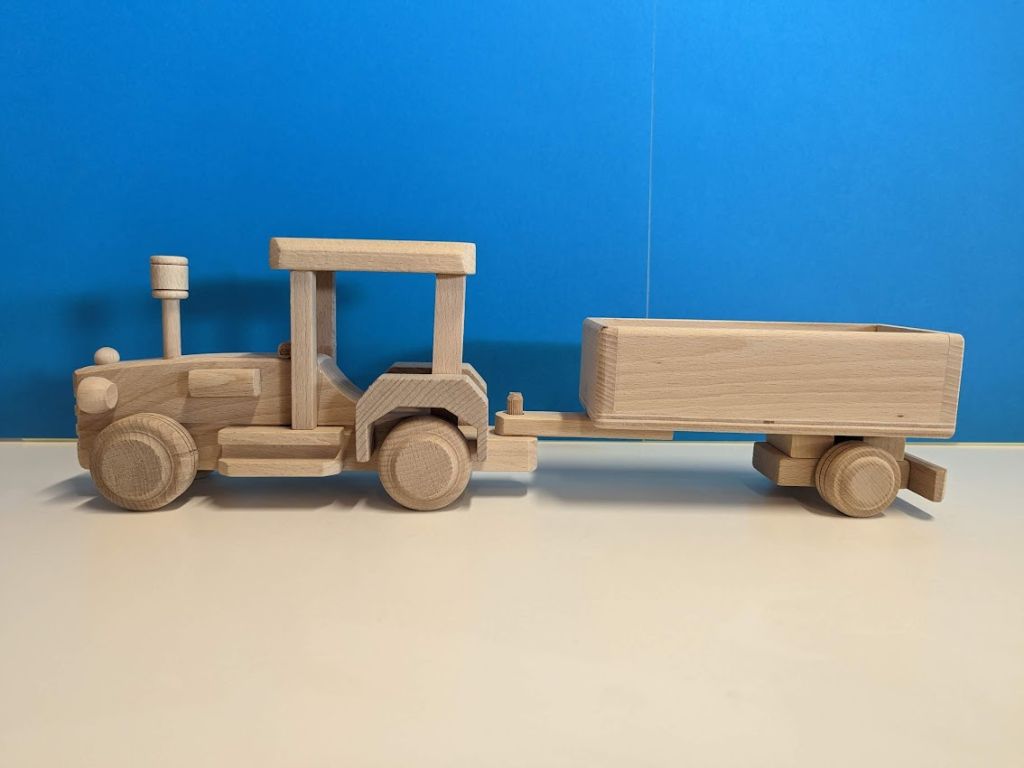 Solidny traktor z przyczepą z bukowego drewna. Idealny do zabawy i dekoracji na lata.
