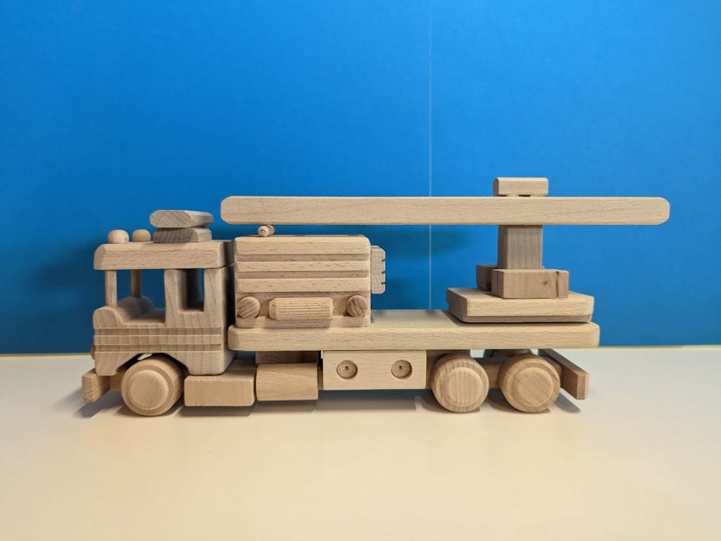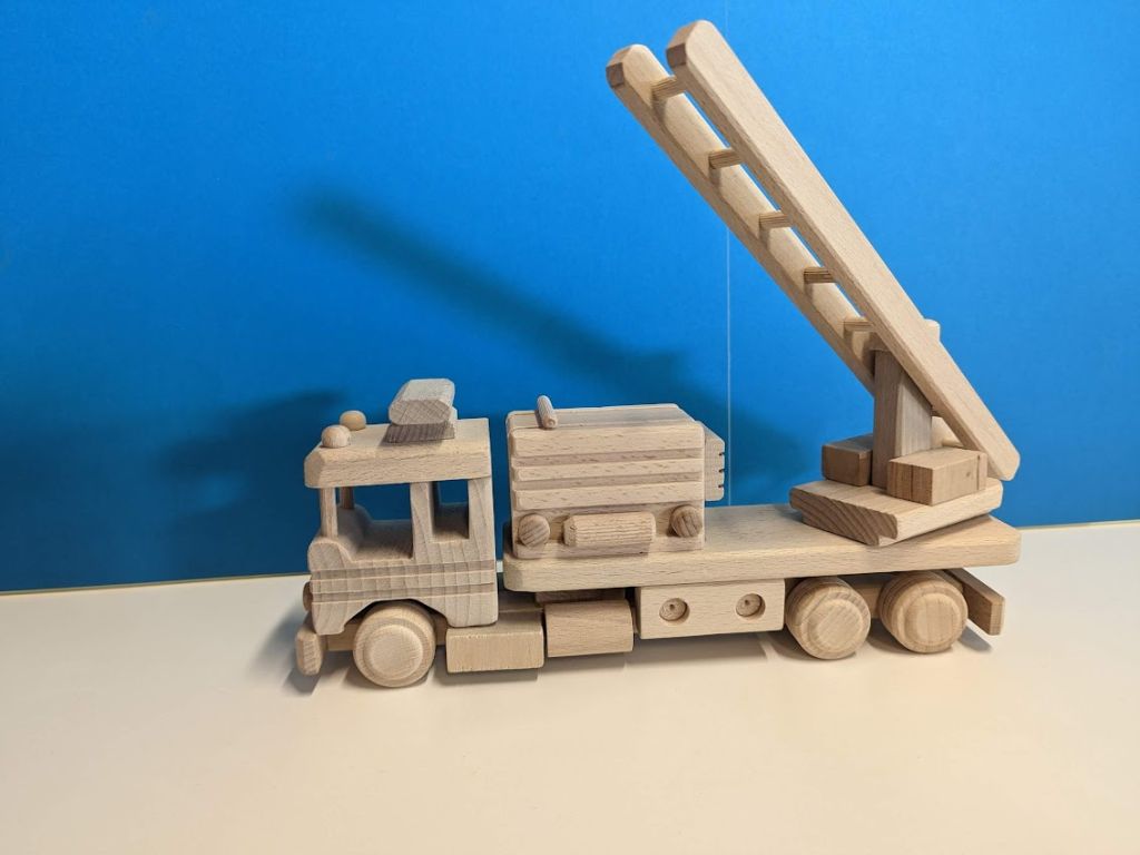 Solidny wóz strażacki z bukowego drewna, ruchoma drabina, ręczna produkcja w Czechach.