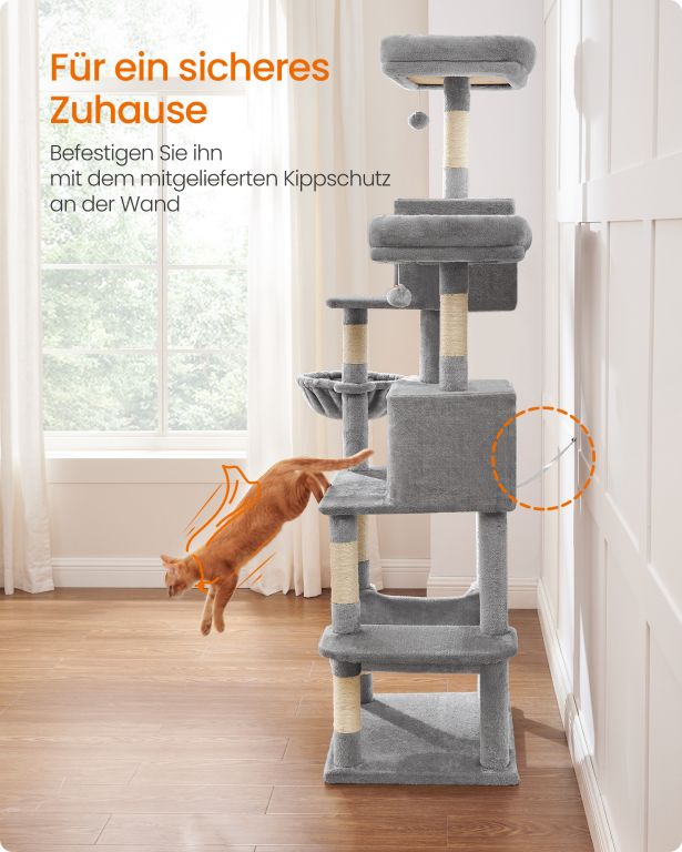 Drzewko dla kota z hamakiem i legowiskiem, 196 cm, szare