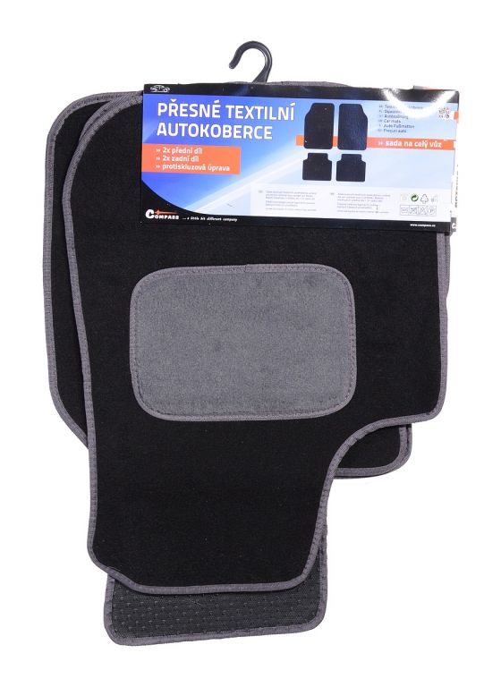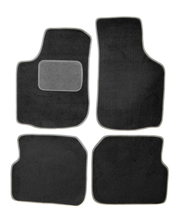 Precyzyjne dywaniki tekstylne do Škody Octavia I., rok produkcji 1997-2003. Zestaw 4 sztuk (2 x przód, 2 x tył). Mają czarny design z szarym wykończeniem i szarym wzmocnieniem dywanika kierowcy pod pedałami.