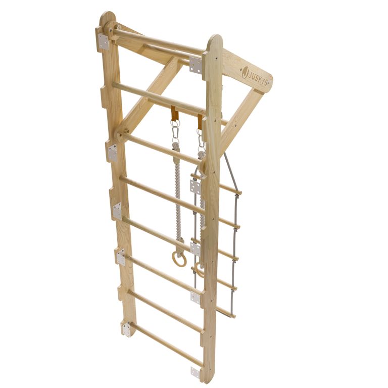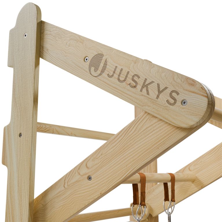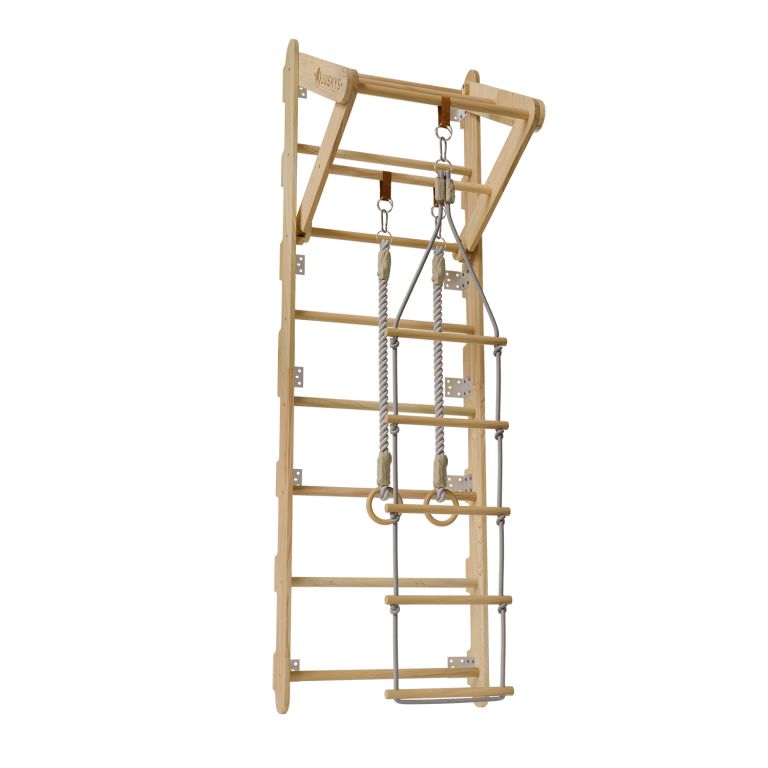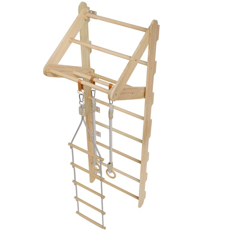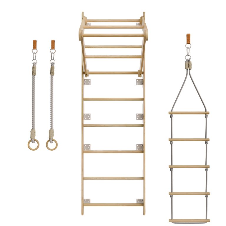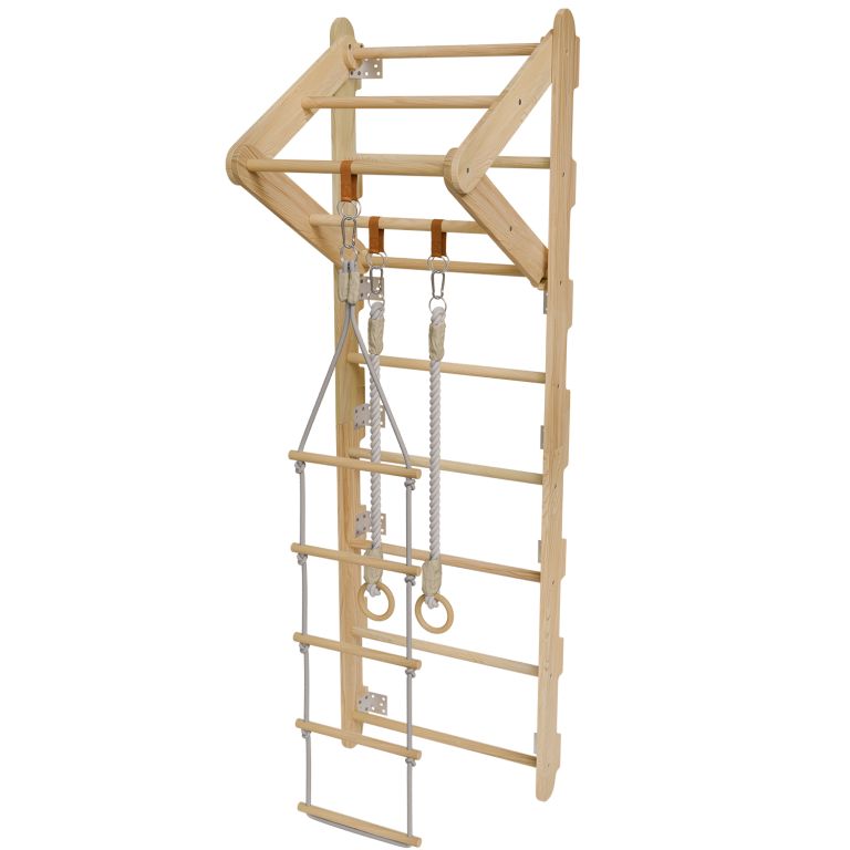 Naturalny materiał i stabilna konstrukcja zapewniają wysoką trwałość i bezpieczeństwo podczas użytkowania. Kompaktowe wymiary sprawiają, że drabinki pasują nawet do mniejszych pomieszczeń. Drążek z trójkątem, pierścienie i drabinka linowa są łatwo zdejmowalne i można je dowolnie zamieniać. Dzięki solidnemu montażowi i wytrzymałym linom drabinki wytrzymają intensywną zabawę dzieci w wieku od 3 do 12 lat.