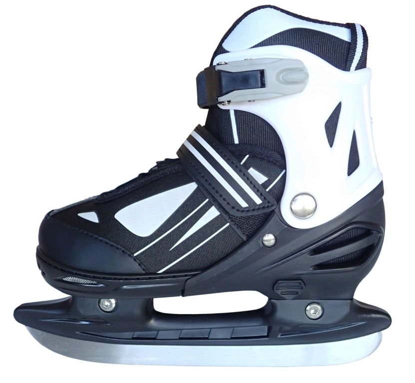 Łyżwy do hokeja ACTION, rozsuwane- 4 rozmiary w jednym. Długość wewnętrznej wkładki , podczas ustawienia najmniejszego rozmiaru 27 wynosi 17 cm. Łatwy do ustawienia rozmiar buta 27-30 = 17 - 19 cm. Łyżwy mają skorupę z plastiku i wewnętrzny bucik tekstylny, który ma miękką wyściółkę dla zabezpieczenia najwyższego komfortu.Dla osiągnięcia właściwego założenia łyżew a konkretnie buta do dyspozycji mamy klasyczne sznurowanie,klamrę z tekstylii na rzep i klamrę z tworzywa sztucznego. Łyżwy są wodoodporne - powierzchnia jest impregnowana ,to broni przenikaniu wody do wnętrza buta i chroni nogi przed przemarznięciem.Zalecamy czas od czasu naimpregnować środkami do tego przeznaczonymi dostępnymi w sieci handlowej Ustawienie ostrza łyżwy: dźwignię u spodu łyżwy obracamy o 90 stopni prostopadle do ostrza. Potem można but zwiększać lub zmniejszać według potrzeby. Następnie konieczne jest zabezpieczenie dźwigni do swojego pierwotnego położenia tak, że jest równoległa względem ostrza łyżwy. Dźwignia może być obracana w obydwie strony,trzeba pamiętać,że musi być ustawiona równolegle względem noża.