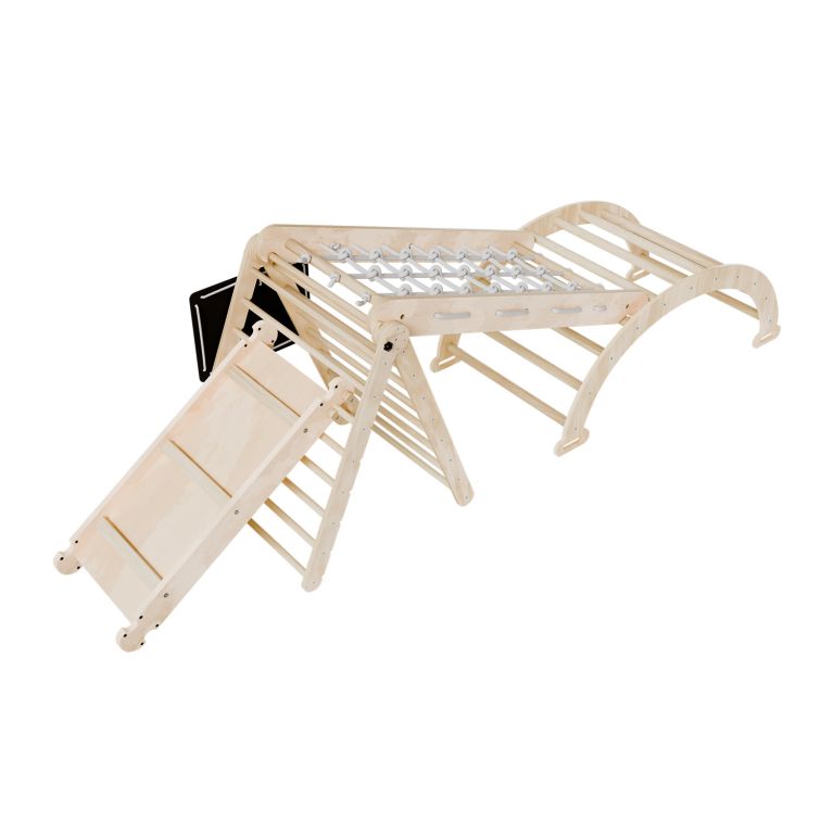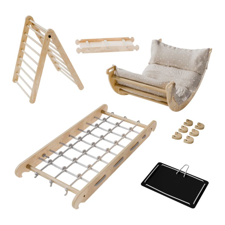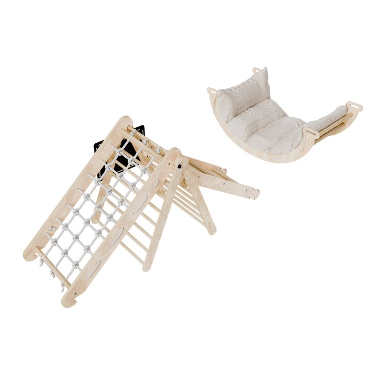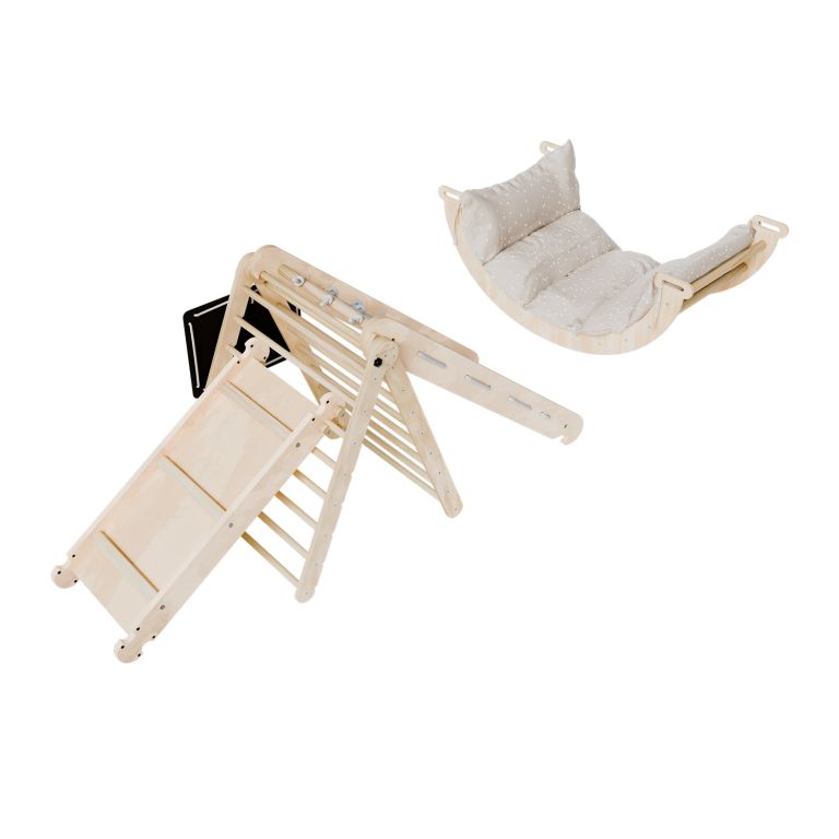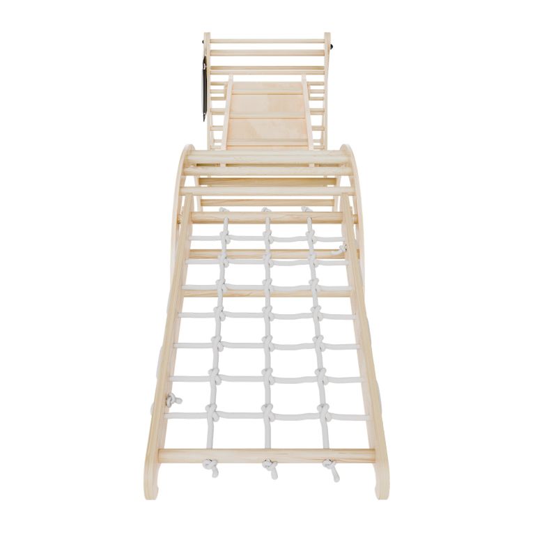 Cały zestaw wykonany jest z naturalnego drewna sosnowego i sklejki, co sprawia, że wygląda lekko, a jednocześnie jest bardzo trwały – każdy element utrzyma do 50 kg. Części można dowolnie przestawiać i łączyć, dzięki czemu łatwo dopasować je do przestrzeni oraz aktualnych zainteresowań dzieci. Huśtawka z poduszką pozwala odpocząć po zabawie, siatka daje alternatywną formę wspinaczki, a tablica rozwija wyobraźnię i spokojniejsze aktywności. Dla większego bezpieczeństwa zaleca się położenie miękkiej maty pod konstrukcją.