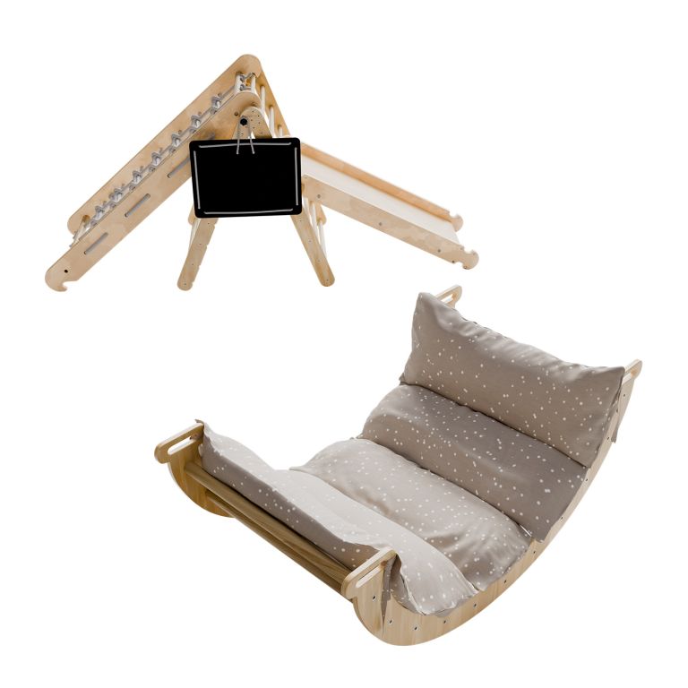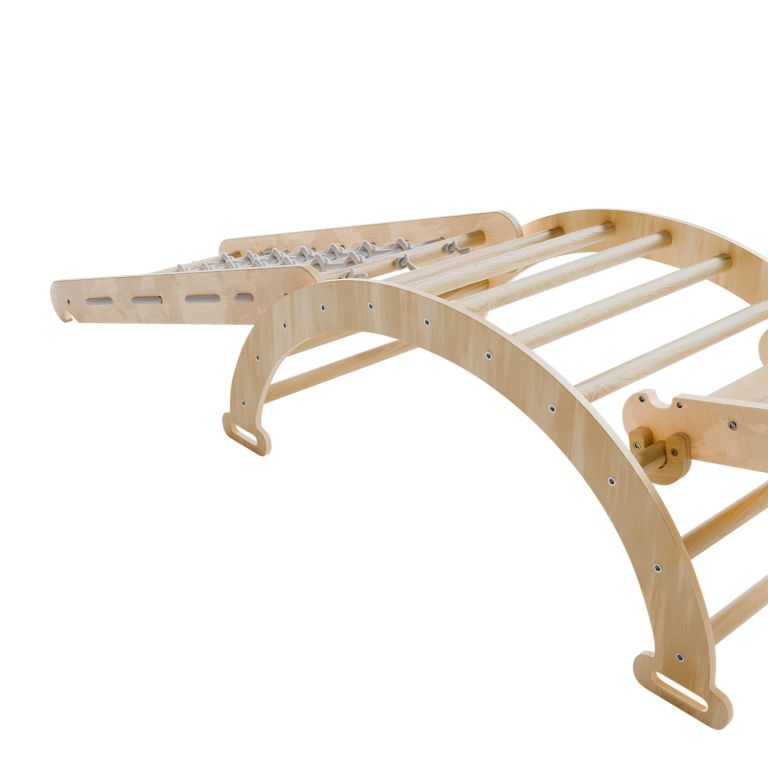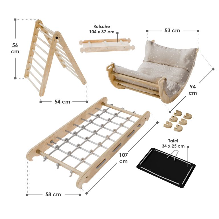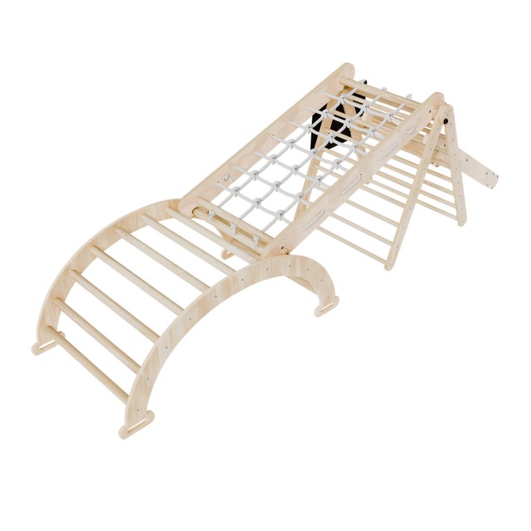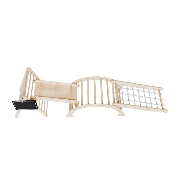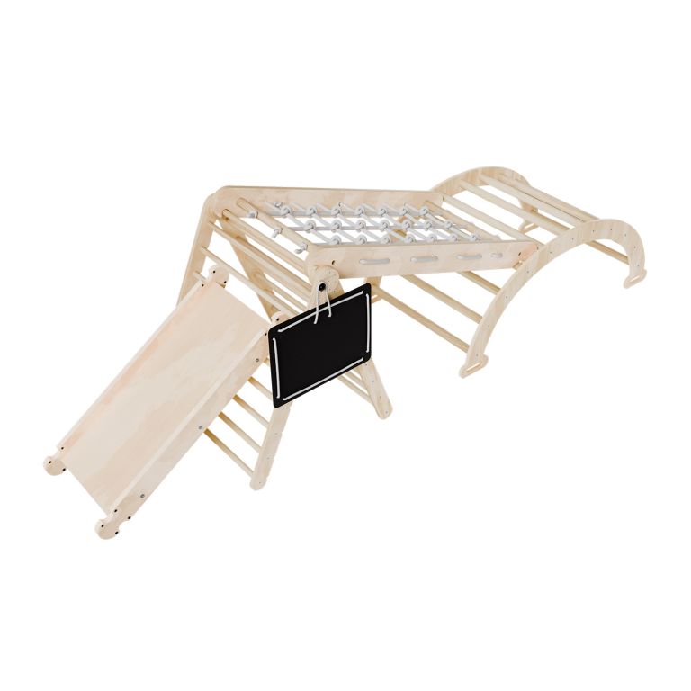 Cały zestaw wykonany jest z naturalnego drewna sosnowego i sklejki, co sprawia, że wygląda lekko, a jednocześnie jest bardzo trwały – każdy element utrzyma do 50 kg. Części można dowolnie przestawiać i łączyć, dzięki czemu łatwo dopasować je do przestrzeni oraz aktualnych zainteresowań dzieci. Huśtawka z poduszką pozwala odpocząć po zabawie, siatka daje alternatywną formę wspinaczki, a tablica rozwija wyobraźnię i spokojniejsze aktywności. Dla większego bezpieczeństwa zaleca się położenie miękkiej maty pod konstrukcją.