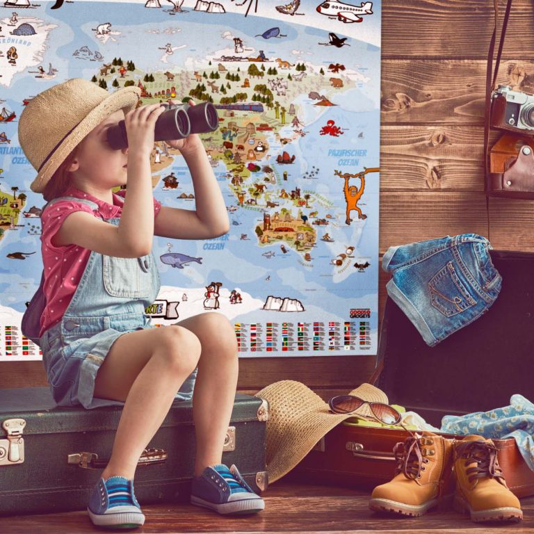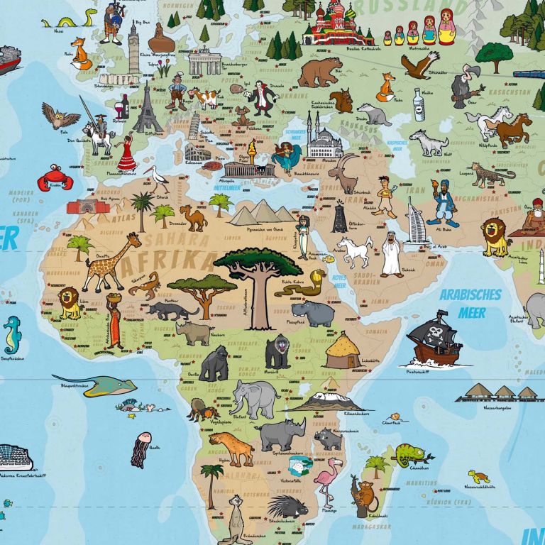Pięknie zaprojektowana i szczegółowa mapa edukacyjna dla dzieci. Cała zawartość mapy dziecięcej jest rysowana ręcznie. Bardzo wartościową treścią dydaktyczną jest fakt, że wszystkie zwierzęta, rośliny i budynki zostały poprawnie przypisane i opisane geograficznie. Na mapie znajduje się niesamowita ilość informacji, które możesz odkryć i nauczyć się. Nazwy krajów, zwierząt, roślin i osobliwości we wszystkich przedstawionych kierunkach inspirują do marzeń. Ten wspaniały plakat dla dzieci jest uzupełniony faktami dotyczącymi każdego kraju, takimi jak stolice, rozmiary krajów i populacji, a także powiązane flagi lub banery.