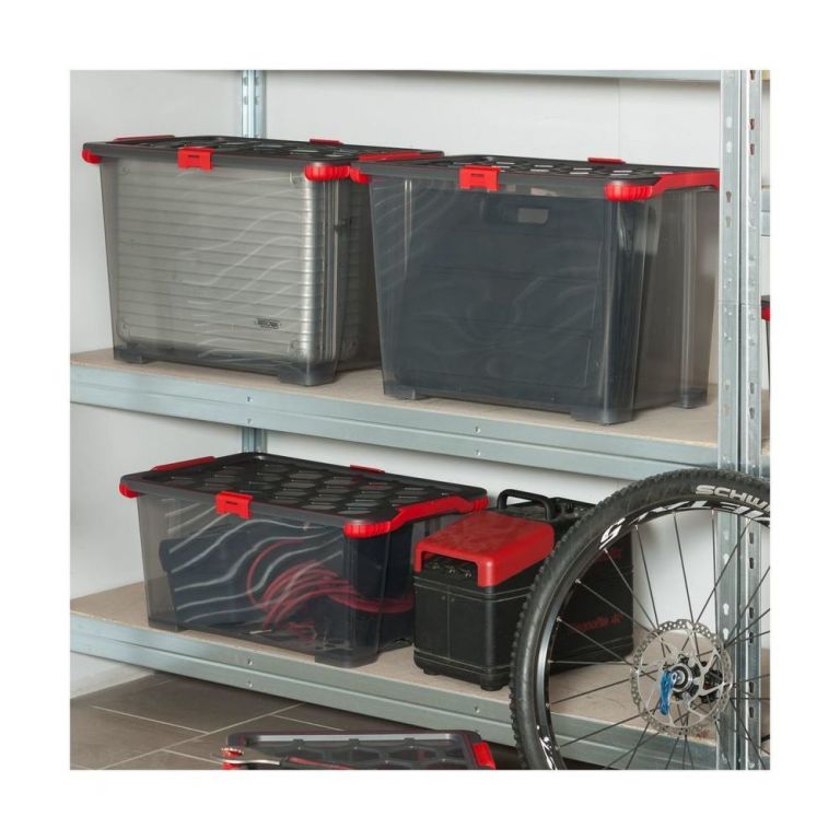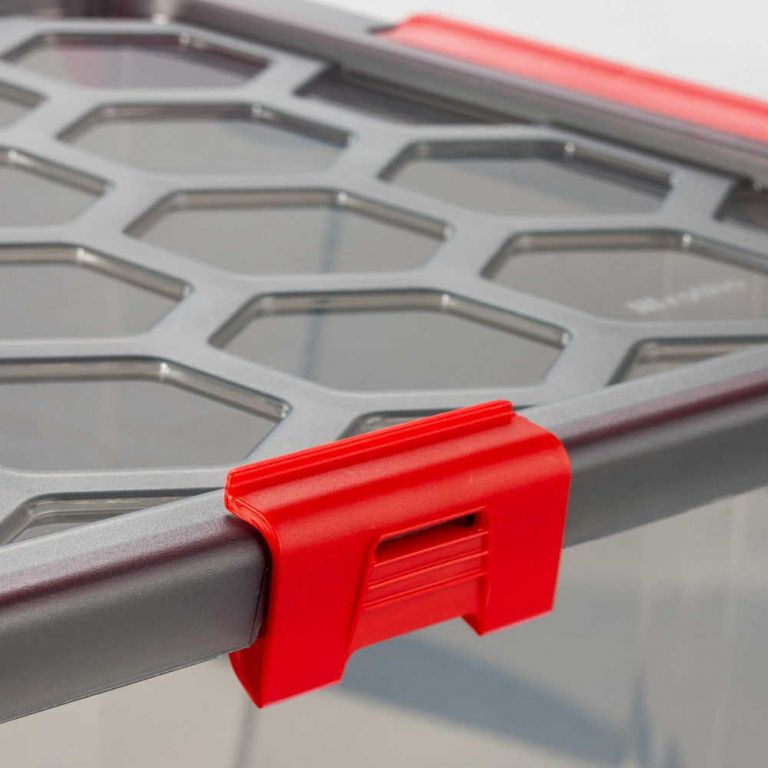 Plastikowe pudełko z pokrywką ma pojemność 30 l. Praktyczne klipsy i plomby chronią zawartość przed wilgocią.