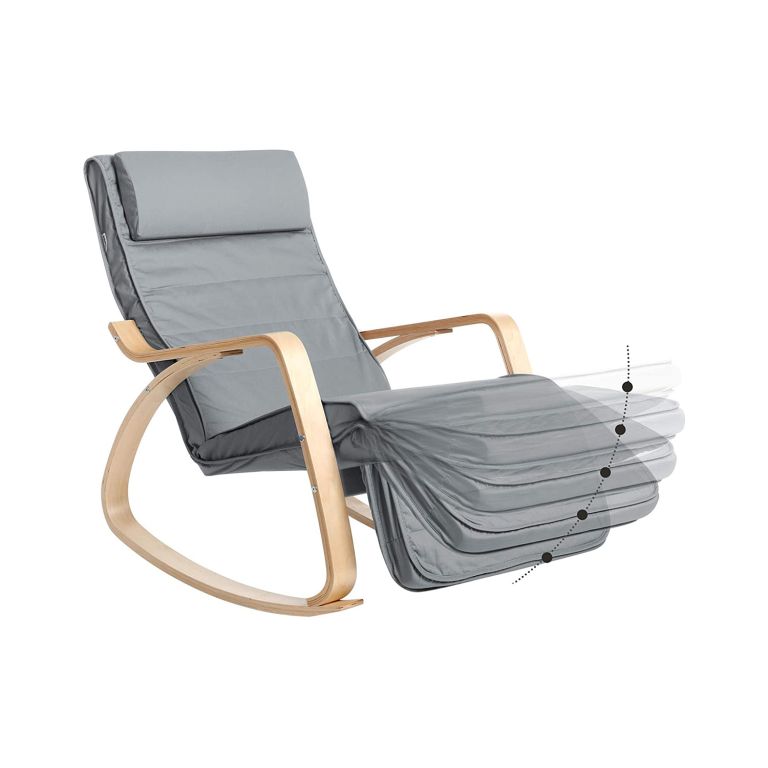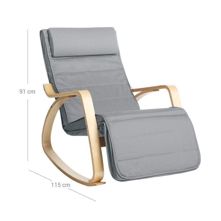 Wymiary fotela to 55 × 80 × 91 cm, a maksymalne obciążenie wynosi 150 kg. Stabilna rama z giętego drewna brzozowego ma trwałe wykończenie. Pokrowiec z czystej bawełny jest przyjemny w dotyku, oddychający i łatwy do zdjęcia oraz prania dzięki zamkowi. Wypełnienie z wysokiej jakości pianki zapewnia wygodę nawet podczas długiego siedzenia. Regulowany podnóżek z 5 pozycjami oraz odpinana poduszka pod głowę i kark zwiększają komfort użytkowania.