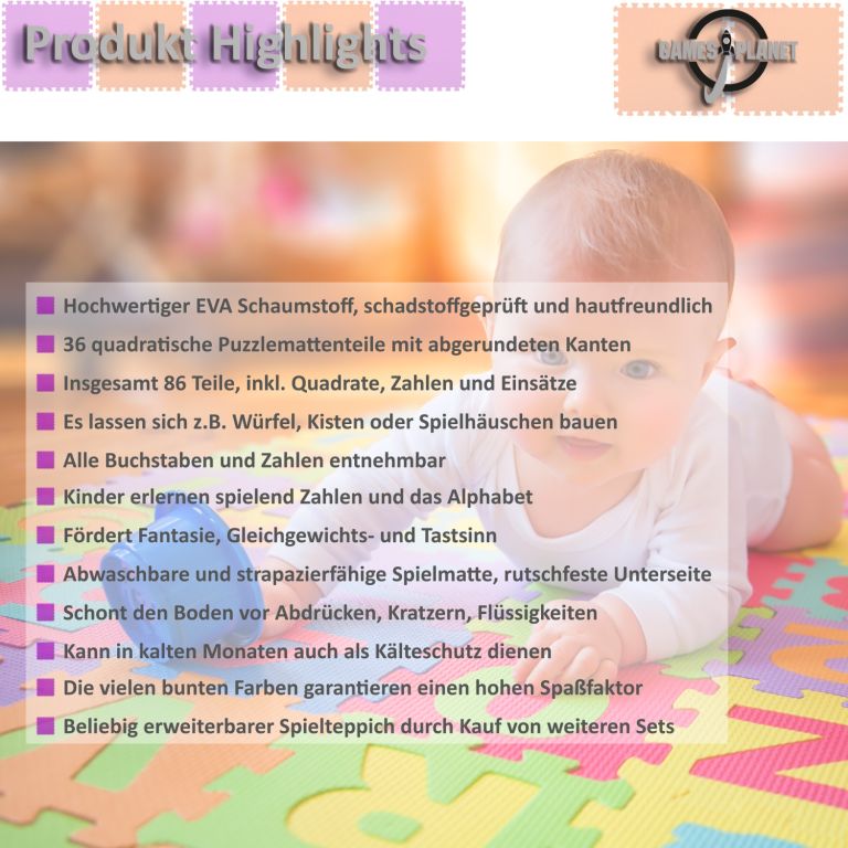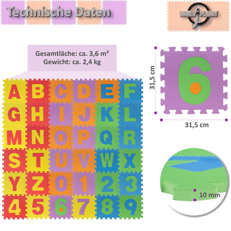 Te puzzle to nie tylko świetna mata do zabawy dla Twojego malucha, ale także pomoc w nauce cyfr i liter alfabetu w zabawny sposób.