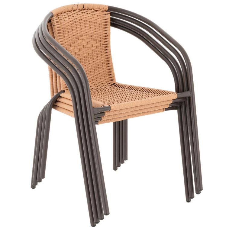 Jeśli chcesz przechować zestaw krzeseł na zimę, możesz je ułożyć jedno na drugim, aby zaoszczędzić dużo miejsca. Nogi krzeseł są wyposażone w gumowe nakładki. Zapobiegają one ślizganiu się, tłumią hałas podczas przesuwania i są delikatne dla podłogi. Rama wykonana jest z malowanej proszkowo stali z matowym wykończeniem. Polirattan jest wykonany z tworzywa sztucznego, odpornego na rozdarcia i ciekawie tkanego.