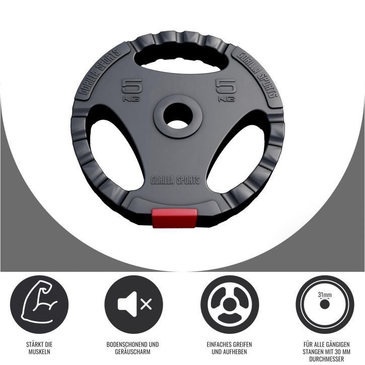 Dzięki wgłębieniom w uchwytach można go ergonomicznie chwycić i używać podczas ćwiczeń. Ponadto dysk ma poręczny otwór o średnicy 31 mm, który umożliwia stosowanie dodatkowych obciążeń na hantlach lub sztangach z prętem o średnicy 30 mm. Zwłaszcza podczas „brzuszków" z ciężarkami można czuć się dość niekomfortowo, jeśli ciężar jest trudny do utrzymania. Rozwiązaniem jest obciążnik z plastikowym uchwytem.