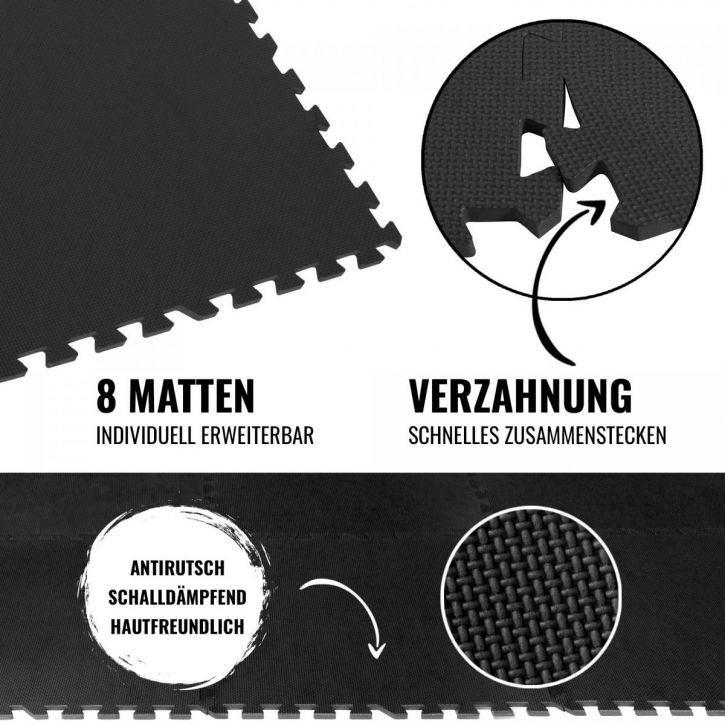 Zestaw podkładek ochronnych Gorilla Sports zawiera zawsze 8 sztuk, które można elastycznie wkładać jedna w drugą dzięki zapięciom.
