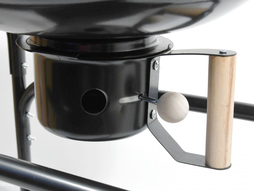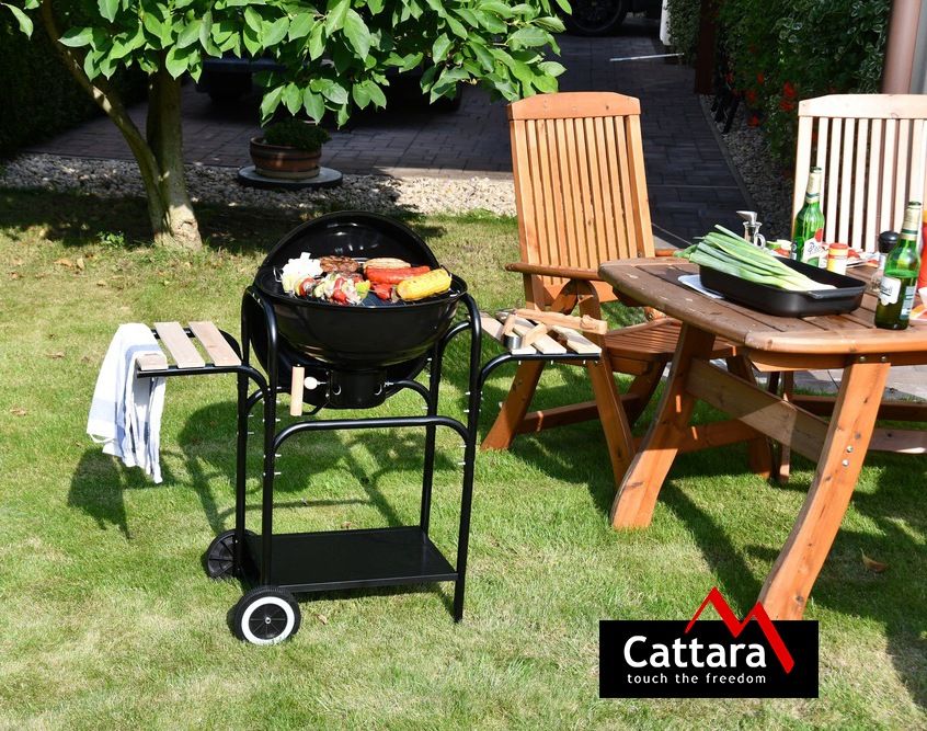Konstrukcja grilla wykonana jest z wysokogatunkowej blachy stalowej z emaliowanym wykończeniem. Uchwyt na pokrywie jest drewniany i ma wystarczająco dużo miejsca na chwyt. Stabilność grilla zapewniają metalowe nóżki, uzupełnione ramą wzmacniającą w dolnej części, dolna dodatkowo wyposażona jest w plastikowe kółka, które gwarantują odpowiednią mobilność. Grill wyposażony jest w regulowaną wentylację oraz wysuwaną popielniczkę. Pokrywka jest całkowicie zdejmowana, z haczykiem po wewnętrznej stronie do zawieszenia z boku grilla. Grill wyposażony jest w ruszt z chromowanej stali, aby móc podgrzać Twoje smakołyki. Miejsce do przechowywania zapewniają dwie drewniane półki o wymiarach 31 x 21 cm umieszczone po bokach grilla.