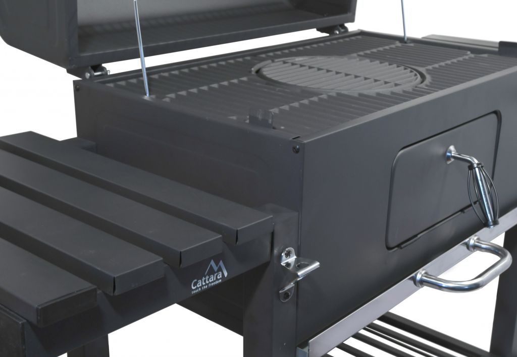 Do przygotowania potraw na ciepło grill wyposażony jest w solidny, trzyczęściowy ruszt żeliwny z okrągłym środkiem. Zamiast wyjmowania można zamiast części środkowej umieścić np. patelnie grillowe, kamień do pizzy itp. (średnica 28-29 cm). Ponadto strefa grillowa wyposażona jest w regał do przechowywania dań gotowych do utrzymywania temperatury lub ich podgrzania.