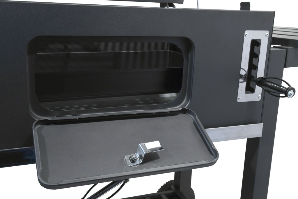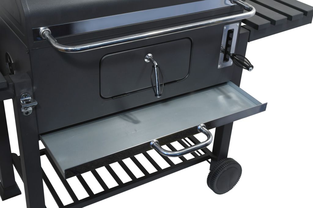 Kolejną zaletą grilla jest grill węglowy o regulowanej wysokości, dzięki czemu przestrzeń do grillowania można regulować za pomocą mechanizmu z przodu, zgodnie z wymaganiami potraw. Drzwiczki z przodu grilla znacznie ułatwiają uzupełnianie węgla. Szuflada na popiół w najniższej części obszaru grilla jest wtedy przewidziana dla łatwiejszego czyszczenia.
