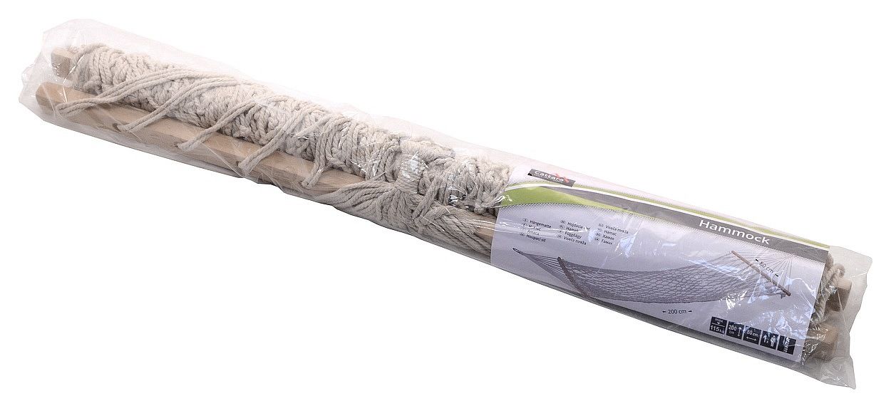 Hamak jest wyposażony w drewniane belki na obu końcach, aby zapewnić doskonałą stabilność i wysoki poziom komfortu. Pręty są naciągane linami 5 mm z miękkich i elastycznych włókien, a końce lin są zaplątane w stalowe pierścienie, aby je zawiesić.