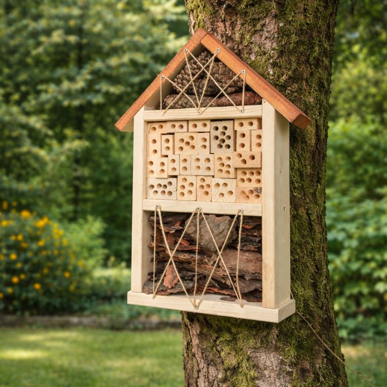 Zaleca się umieszczenie budki dla owadów wyżej od ziemi, najlepiej na drzewie lub ścianie.