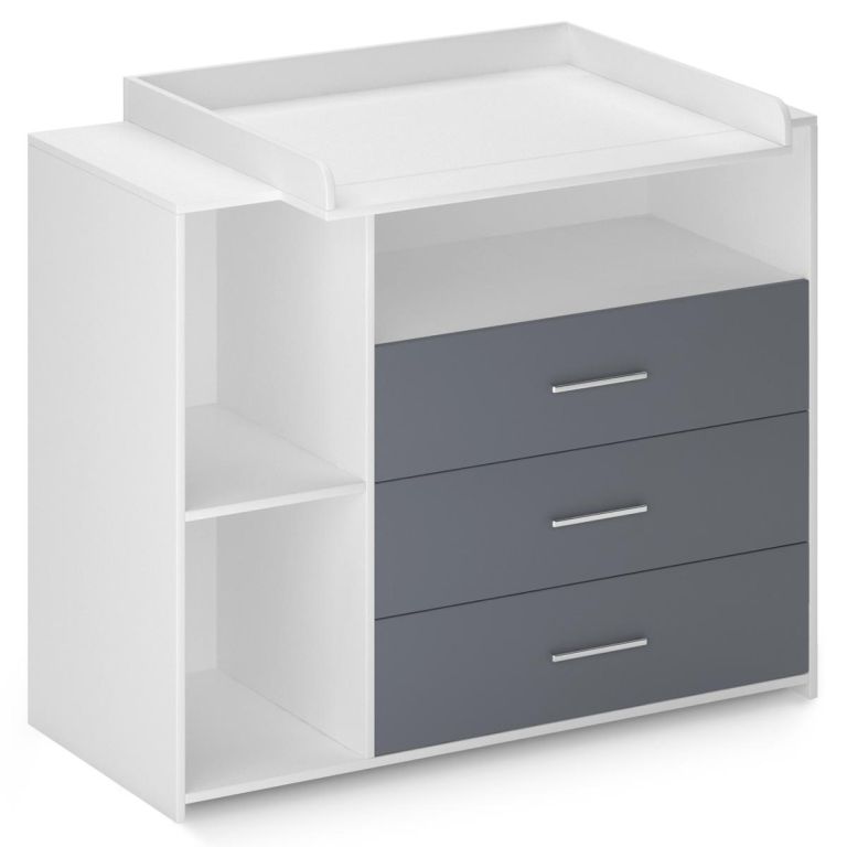 Nasza komoda do przewijania z dużą ilością miejsca do przechowywania w trzech szufladach i trzema otwartymi półkami jest idealnym dodatkiem do pokoju